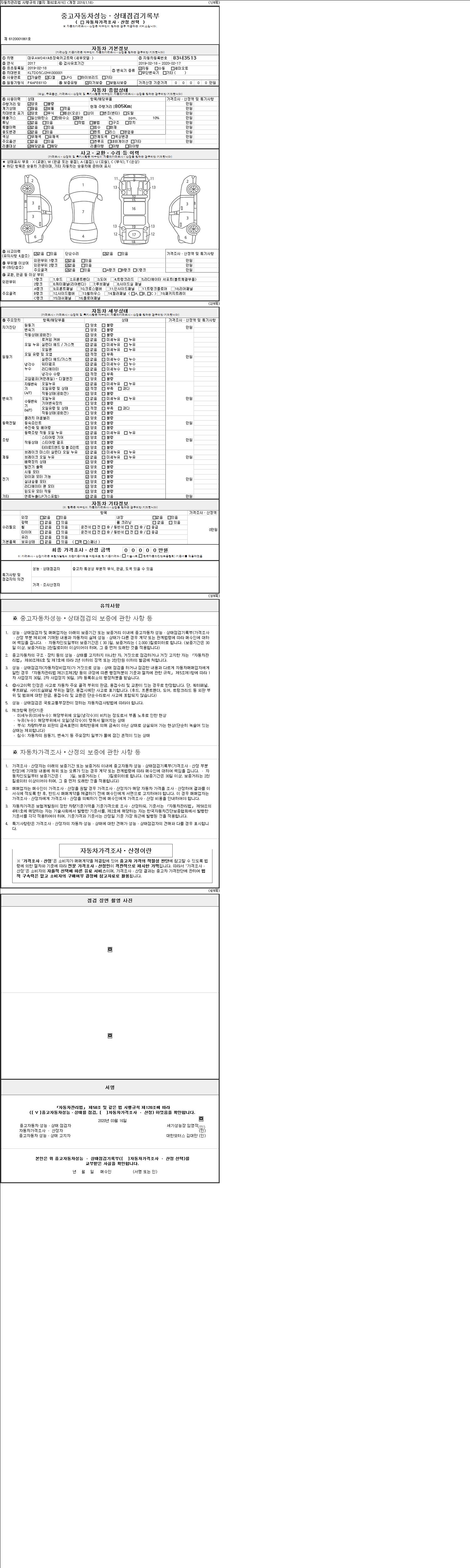 자동차관리법 시행규칙 제120조의 규정에 따라 별지 제 82호서식 《중고자동차 성능, 상태점검 기록부》를 발행한 성능, 상태점검자 및 매매자는 아래의 보증기간 또는 보증거리 이내의 중고자동차, 성능점검 기록부에 기재된 내용과 자동차의 실제 성능, 상태가 다른 경우 계약 또는 관계법령에 따라 매수인에 대하여 책임을 집니다.