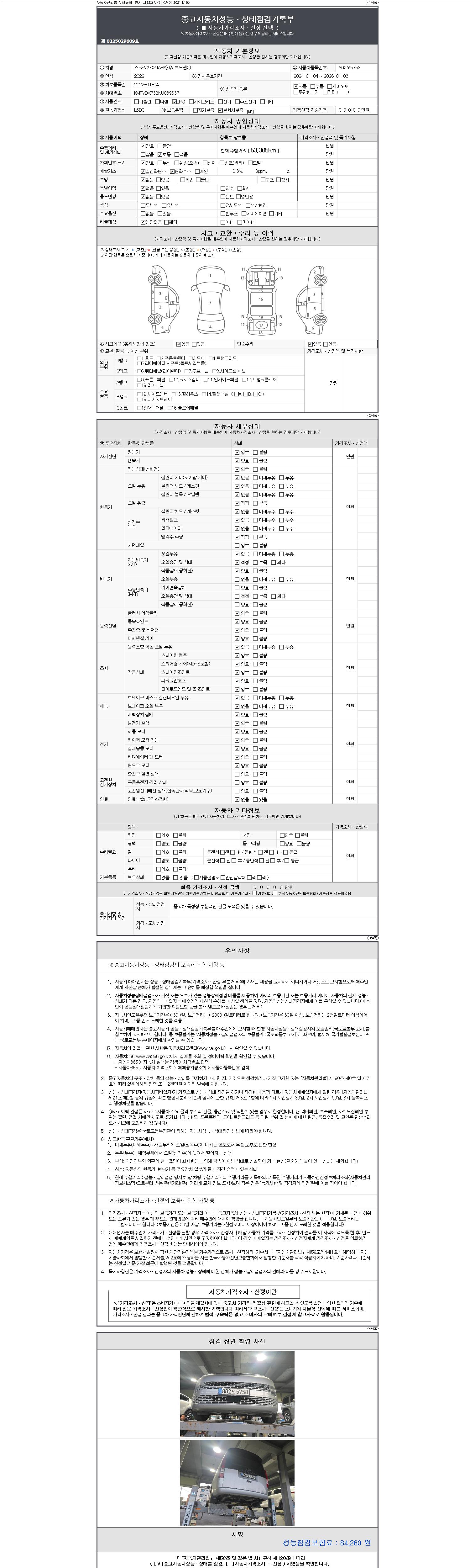 자동차관리법 시행규칙 제120조의 규정에 따라 별지 제 82호서식 《중고자동차 성능, 상태점검 기록부》를 발행한 성능, 상태점검자 및 매매자는 아래의 보증기간 또는 보증거리 이내의 중고자동차, 성능점검 기록부에 기재된 내용과 자동차의 실제 성능, 상태가 다른 경우 계약 또는 관계법령에 따라 매수인에 대하여 책임을 집니다.