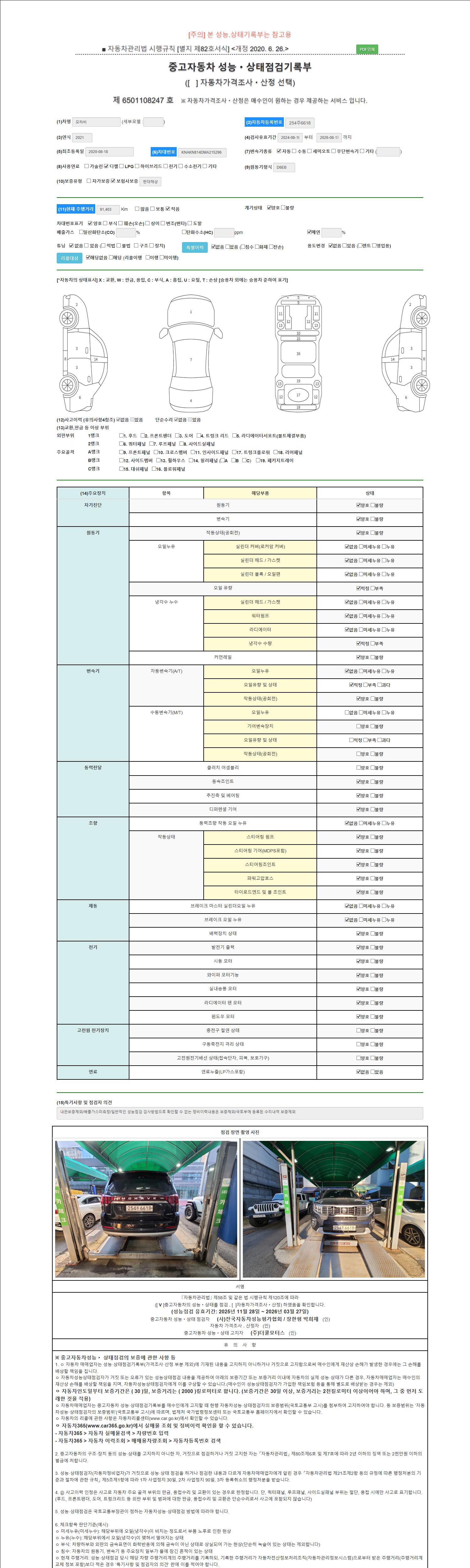 자동차관리법 시행규칙 제120조의 규정에 따라 별지 제 82호서식 《중고자동차 성능, 상태점검 기록부》를 발행한 성능, 상태점검자 및 매매자는 아래의 보증기간 또는 보증거리 이내의 중고자동차, 성능점검 기록부에 기재된 내용과 자동차의 실제 성능, 상태가 다른 경우 계약 또는 관계법령에 따라 매수인에 대하여 책임을 집니다.