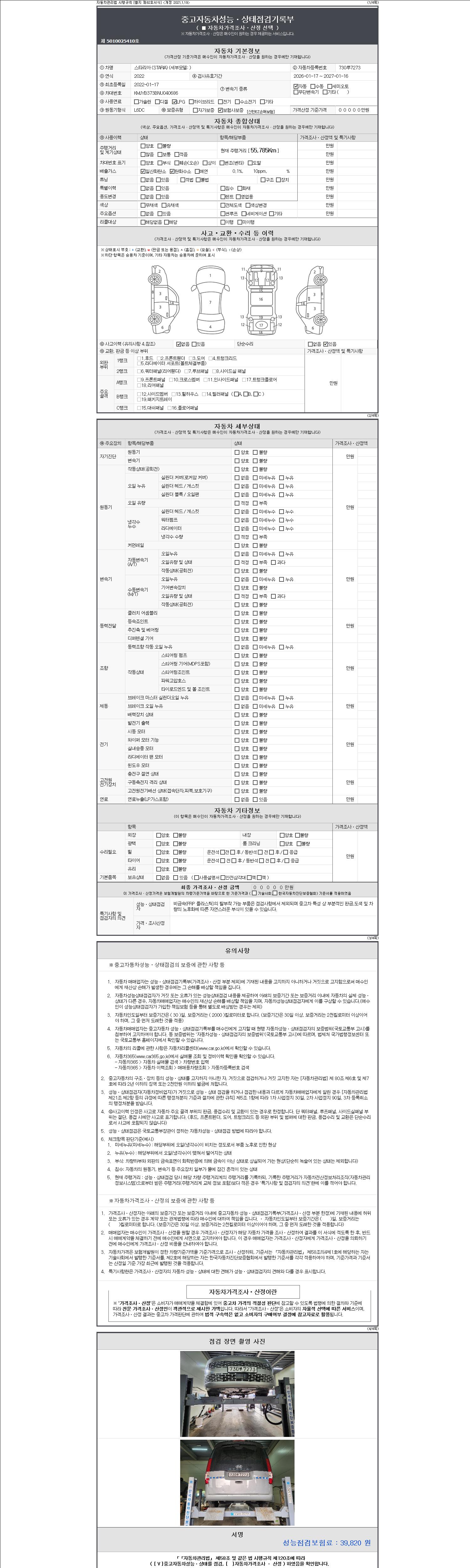 자동차관리법 시행규칙 제120조의 규정에 따라 별지 제 82호서식 《중고자동차 성능, 상태점검 기록부》를 발행한 성능, 상태점검자 및 매매자는 아래의 보증기간 또는 보증거리 이내의 중고자동차, 성능점검 기록부에 기재된 내용과 자동차의 실제 성능, 상태가 다른 경우 계약 또는 관계법령에 따라 매수인에 대하여 책임을 집니다.