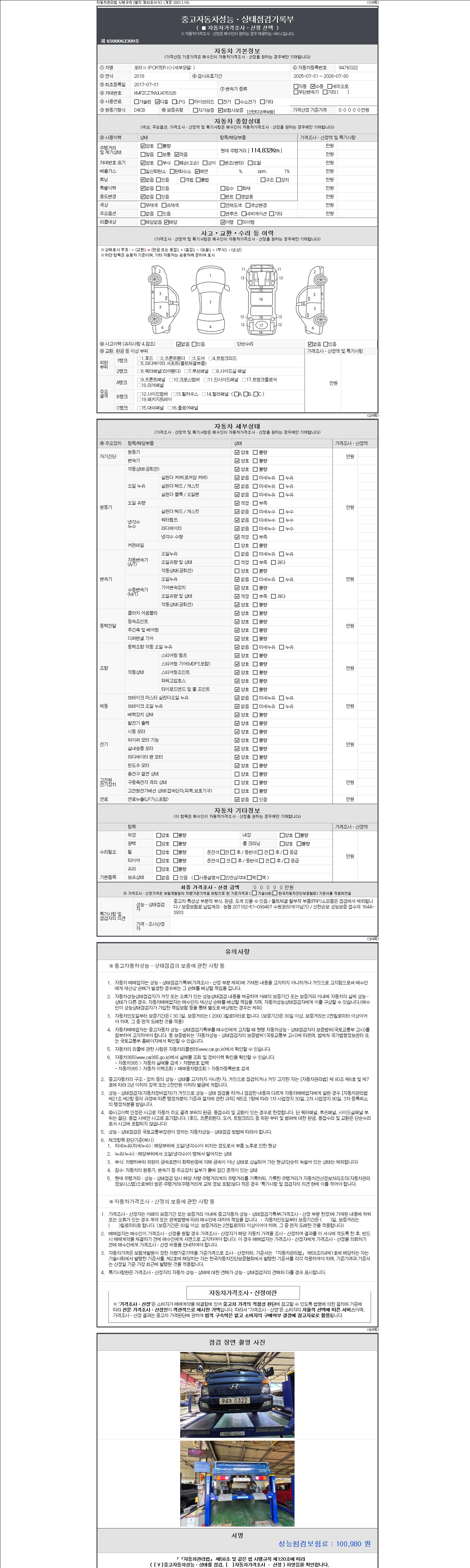 자동차관리법 시행규칙 제120조의 규정에 따라 별지 제 82호서식 《중고자동차 성능, 상태점검 기록부》를 발행한 성능, 상태점검자 및 매매자는 아래의 보증기간 또는 보증거리 이내의 중고자동차, 성능점검 기록부에 기재된 내용과 자동차의 실제 성능, 상태가 다른 경우 계약 또는 관계법령에 따라 매수인에 대하여 책임을 집니다.