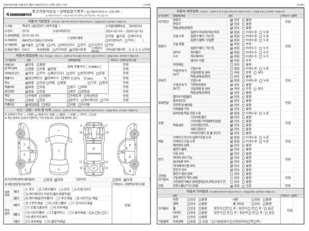 -중고자동차 매매업자를 통해 차량을 구입하실 경우 반드시 "중고자동차 성능, 상태점검 기록부"를 교뷰 받으셔야 하며, 매매업자는 반드시 의무 교부 하여야 압니다.