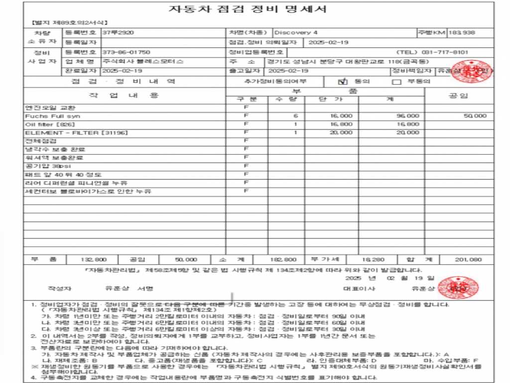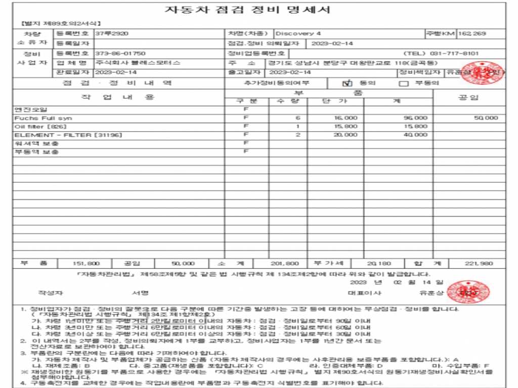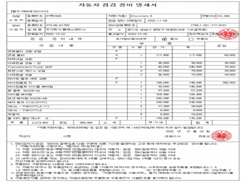 자동차관리법 시행규칙 제120조의 규정에 따라 별지 제 82호서식 《중고자동차 성능, 상태점검 기록부》를 발행한 성능, 상태점검자 및 매매자는 아래의 보증기간 또는 보증거리 이내의 중고자동차, 성능점검 기록부에 기재된 내용과 자동차의 실제 성능, 상태가 다른 경우 계약 또는 관계법령에 따라 매수인에 대하여 책임을 집니다.