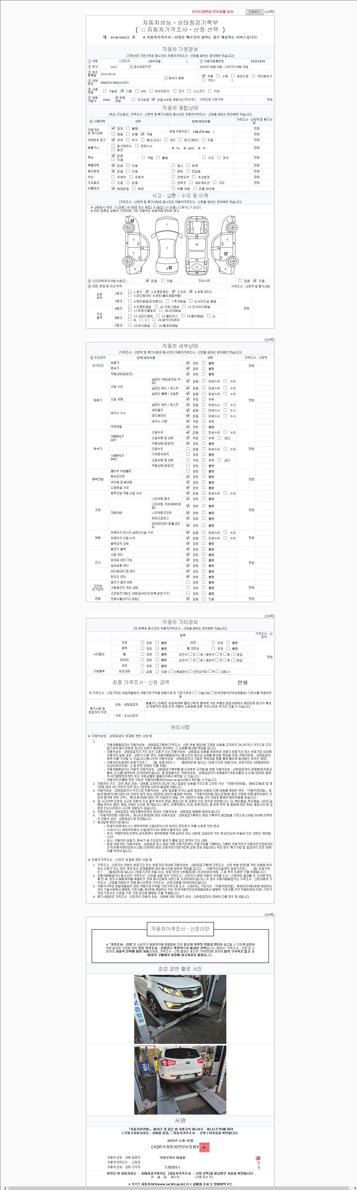 사고유무 성능기록부 참조 제시번호 제 2025208073 호