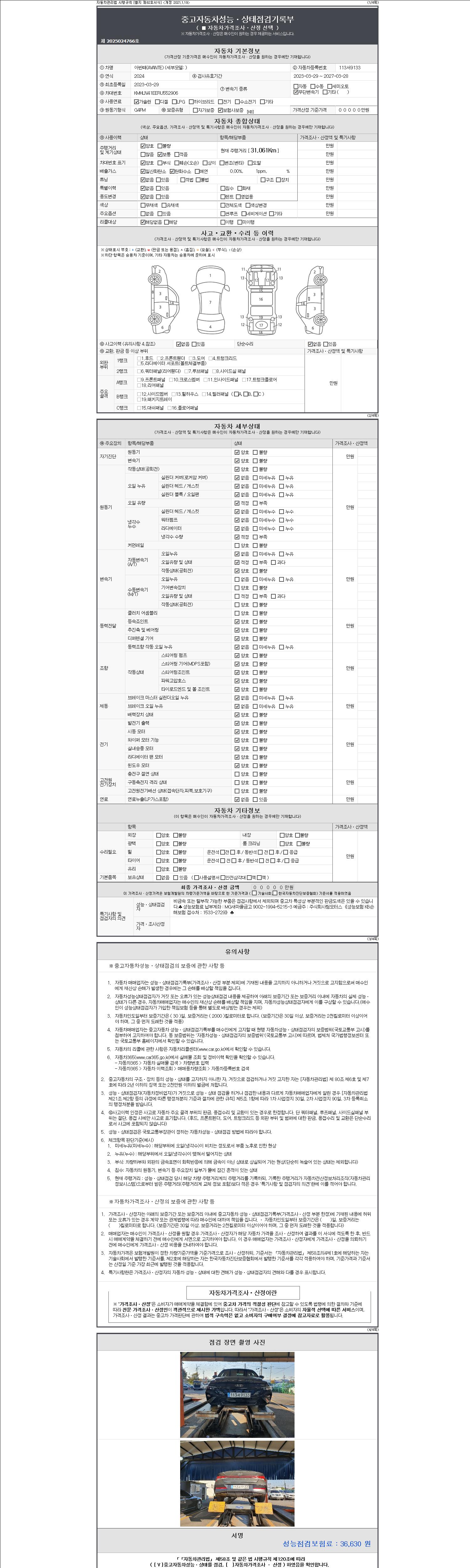 자동차관리법 시행규칙 제120조의 규정에 따라 별지 제 82호서식 《중고자동차 성능, 상태점검 기록부》를 발행한 성능, 상태점검자 및 매매자는 아래의 보증기간 또는 보증거리 이내의 중고자동차, 성능점검 기록부에 기재된 내용과 자동차의 실제 성능, 상태가 다른 경우 계약 또는 관계법령에 따라 매수인에 대하여 책임을 집니다.