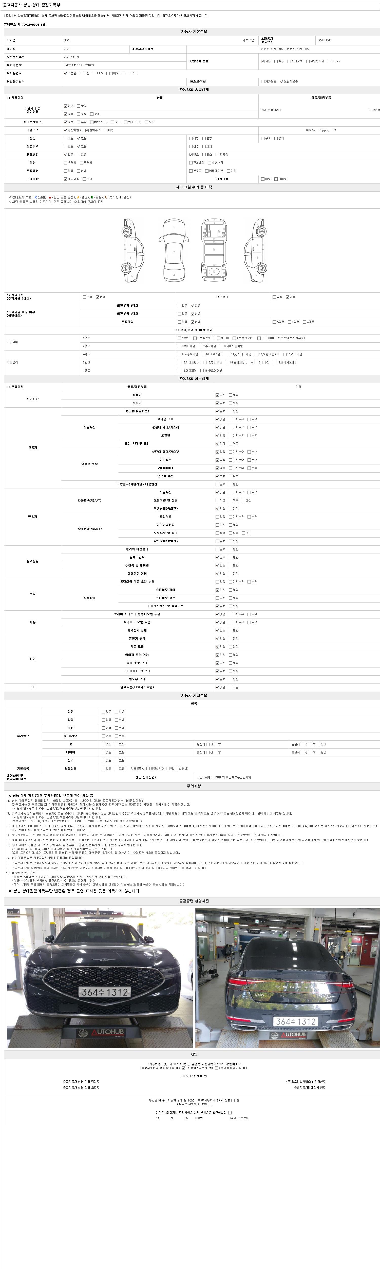 자동차관리법 시행규칙 제120조의 규정에 따라 별지 제 82호서식 《중고자동차 성능, 상태점검 기록부》를 발행한 성능, 상태점검자 및 매매자는 아래의 보증기간 또는 보증거리 이내의 중고자동차, 성능점검 기록부에 기재된 내용과 자동차의 실제 성능, 상태가 다른 경우 계약 또는 관계법령에 따라 매수인에 대하여 책임을 집니다.