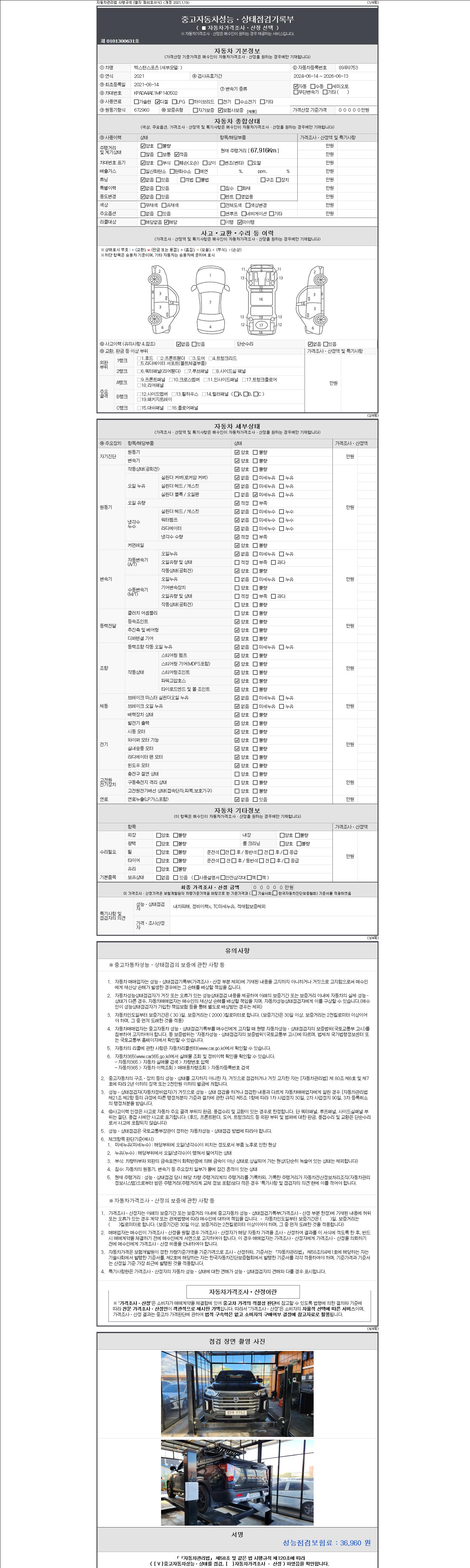 자동차관리법 시행규칙 제120조의 규정에 따라 별지 제 82호서식 《중고자동차 성능, 상태점검 기록부》를 발행한 성능, 상태점검자 및 매매자는 아래의 보증기간 또는 보증거리 이내의 중고자동차, 성능점검 기록부에 기재된 내용과 자동차의 실제 성능, 상태가 다른 경우 계약 또는 관계법령에 따라 매수인에 대하여 책임을 집니다.