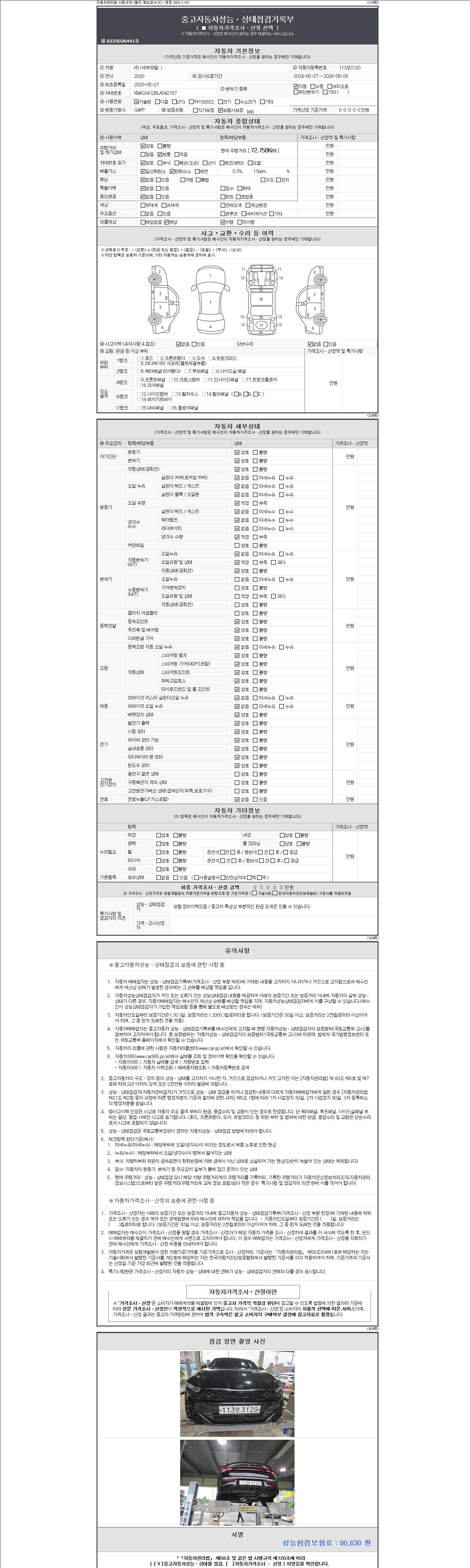 자동차관리법 시행규칙 제120조의 규정에 따라 별지 제 82호서식 《중고자동차 성능, 상태점검 기록부》를 발행한 성능, 상태점검자 및 매매자는 아래의 보증기간 또는 보증거리 이내의 중고자동차, 성능점검 기록부에 기재된 내용과 자동차의 실제 성능, 상태가 다른 경우 계약 또는 관계법령에 따라 매수인에 대하여 책임을 집니다.