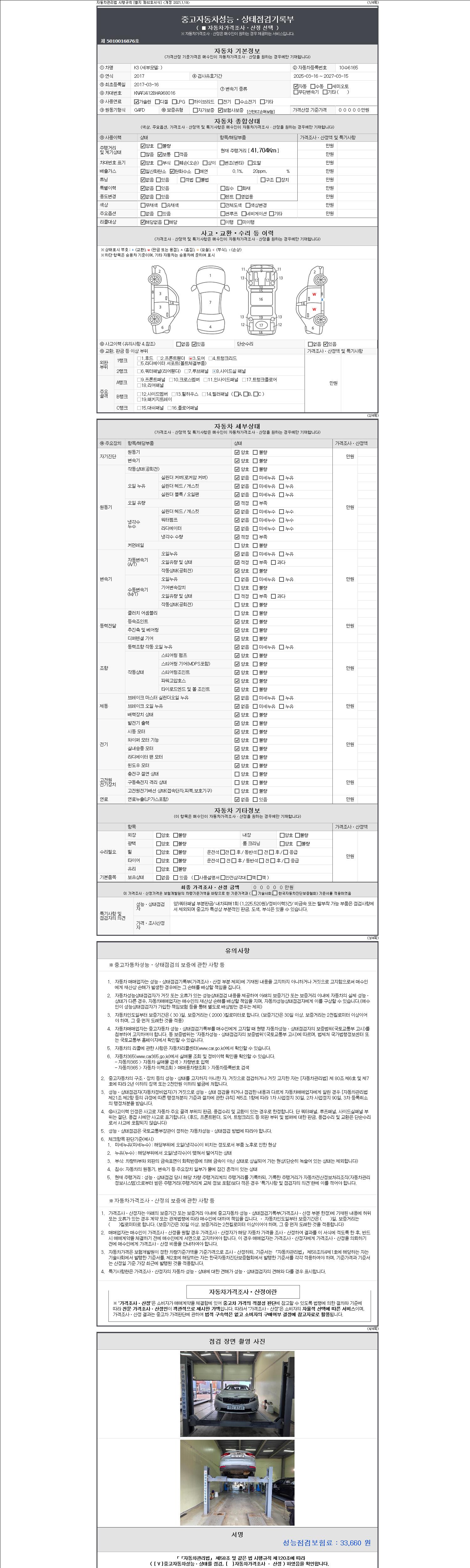 자동차관리법 시행규칙 제120조의 규정에 따라 별지 제 82호서식 《중고자동차 성능, 상태점검 기록부》를 발행한 성능, 상태점검자 및 매매자는 아래의 보증기간 또는 보증거리 이내의 중고자동차, 성능점검 기록부에 기재된 내용과 자동차의 실제 성능, 상태가 다른 경우 계약 또는 관계법령에 따라 매수인에 대하여 책임을 집니다.