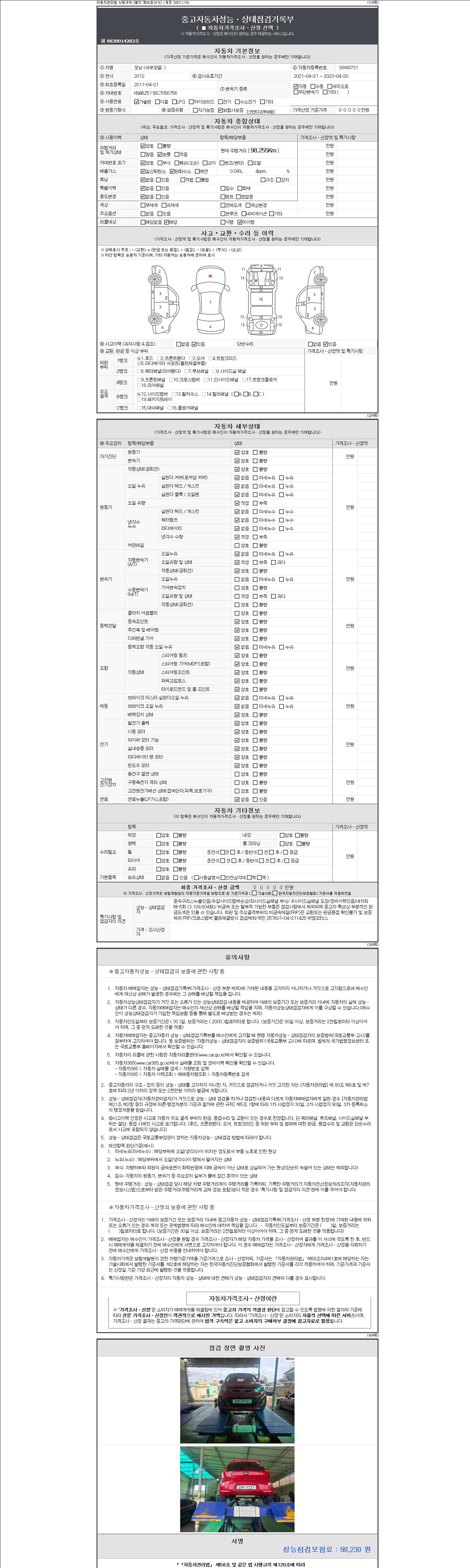 -중고자동차 매매업자를 통해 차량을 구입하실 경우 반드시 "중고자동차 성능, 상태점검 기록부"를 교뷰 받으셔야 하며, 매매업자는 반드시 의무 교부 하여야 압니다.