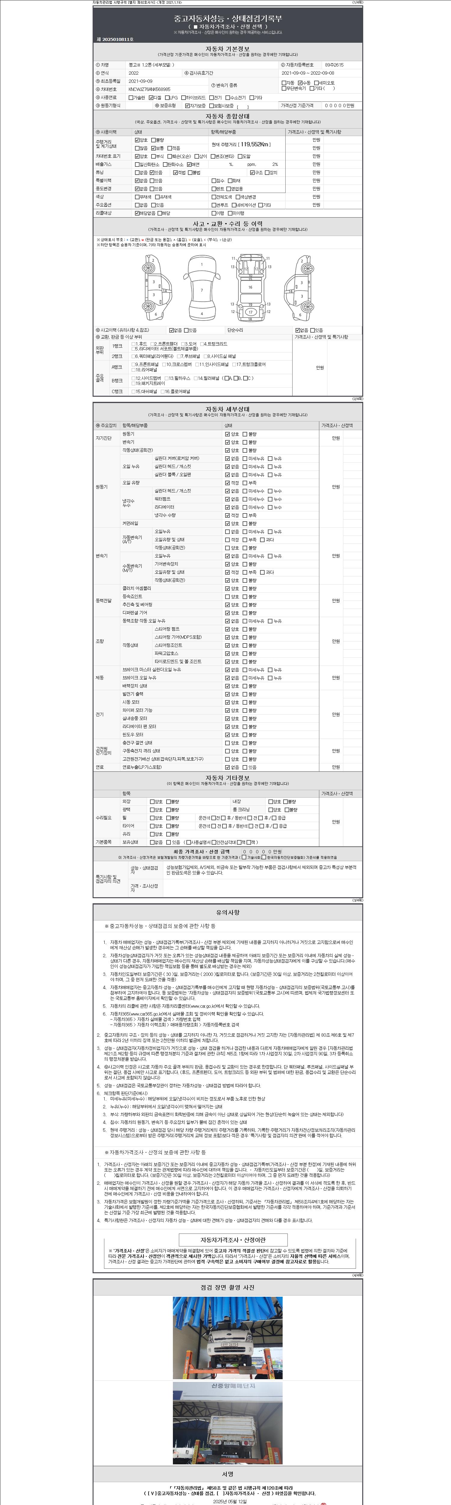 자동차관리법 시행규칙 제120조의 규정에 따라 별지 제 82호서식 《중고자동차 성능, 상태점검 기록부》를 발행한 성능, 상태점검자 및 매매자는 아래의 보증기간 또는 보증거리 이내의 중고자동차, 성능점검 기록부에 기재된 내용과 자동차의 실제 성능, 상태가 다른 경우 계약 또는 관계법령에 따라 매수인에 대하여 책임을 집니다.
