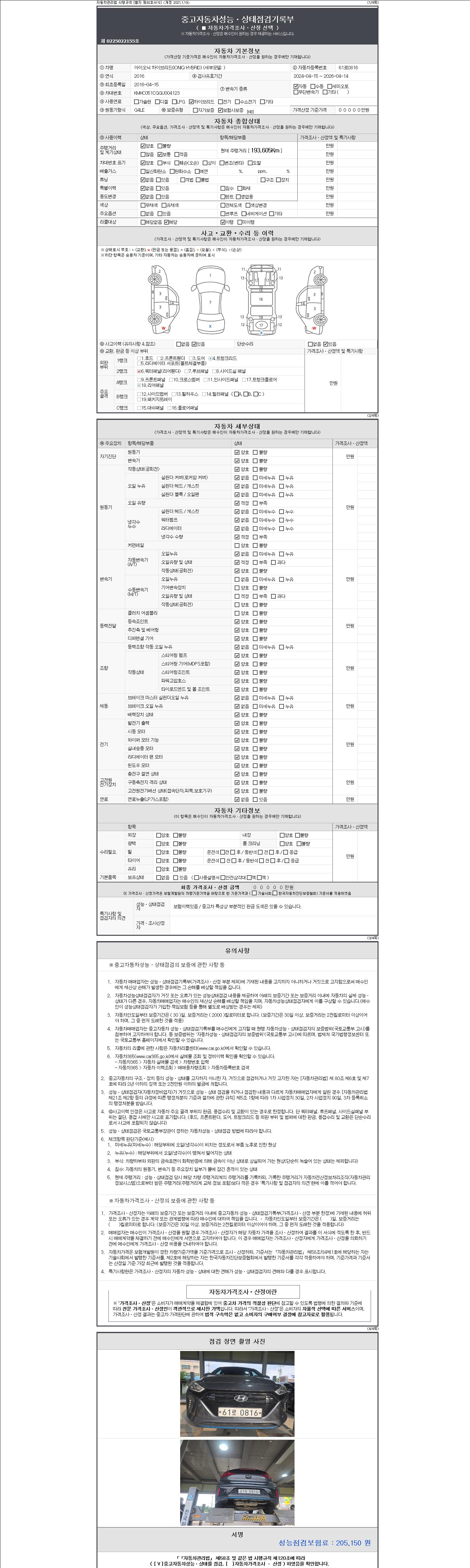 주행거리 193,605 km 차량번호 61로0816