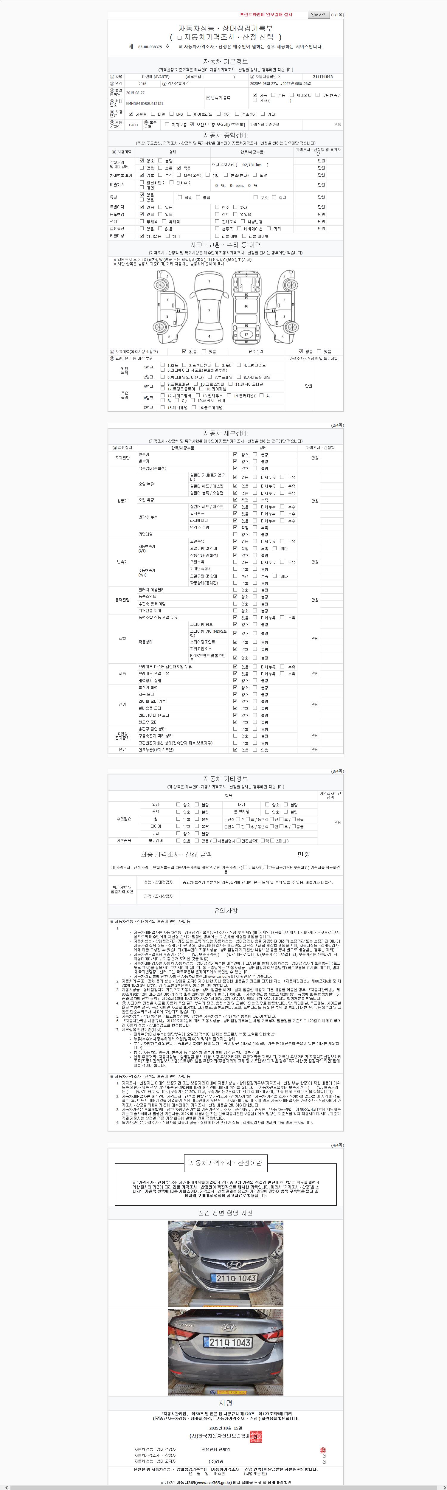 | 주행거리 | 97,048 km | 차량번호 | 211다1043 |