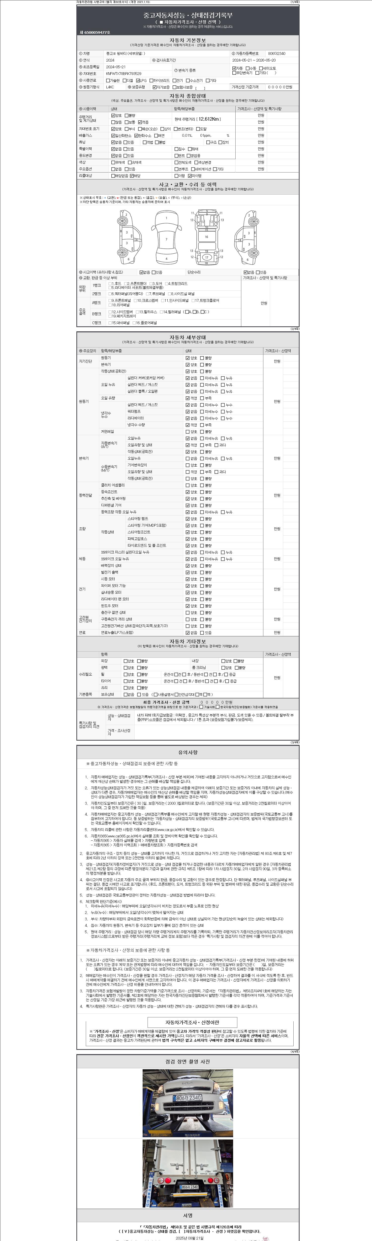 자동차관리법 시행규칙 제120조의 규정에 따라 별지 제 82호서식 《중고자동차 성능, 상태점검 기록부》를 발행한 성능, 상태점검자 및 매매자는 아래의 보증기간 또는 보증거리 이내의 중고자동차, 성능점검 기록부에 기재된 내용과 자동차의 실제 성능, 상태가 다른 경우 계약 또는 관계법령에 따라 매수인에 대하여 책임을 집니다.