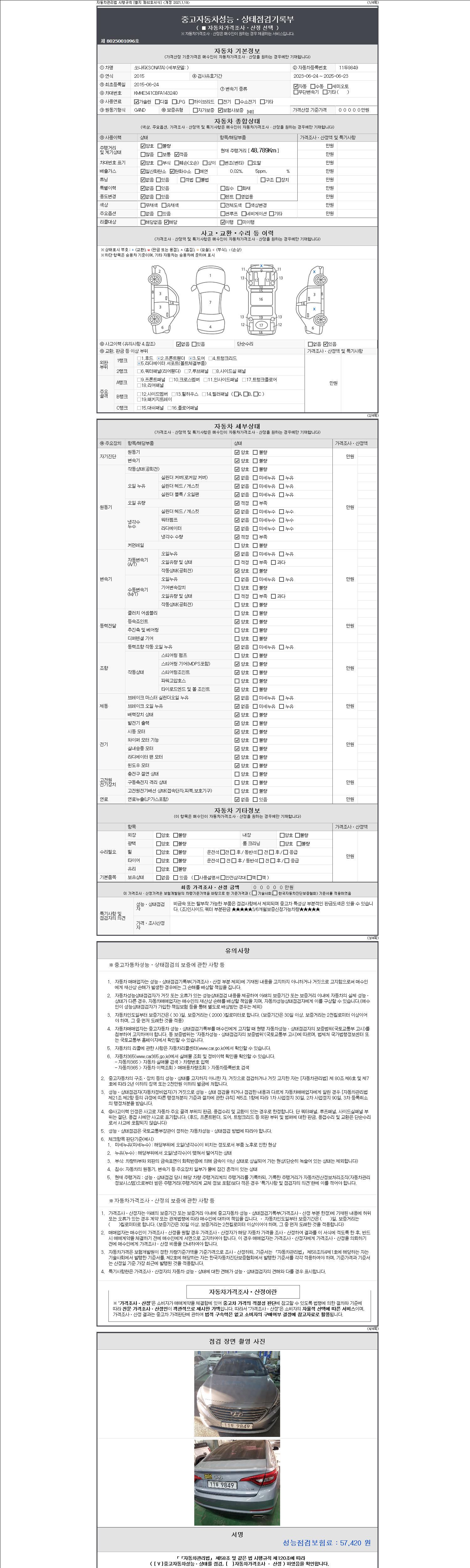 자동차관리법 시행규칙 제120조의 규정에 따라 별지 제 82호서식 《중고자동차 성능, 상태점검 기록부》를 발행한 성능, 상태점검자 및 매매자는 아래의 보증기간 또는 보증거리 이내의 중고자동차, 성능점검 기록부에 기재된 내용과 자동차의 실제 성능, 상태가 다른 경우 계약 또는 관계법령에 따라 매수인에 대하여 책임을 집니다.