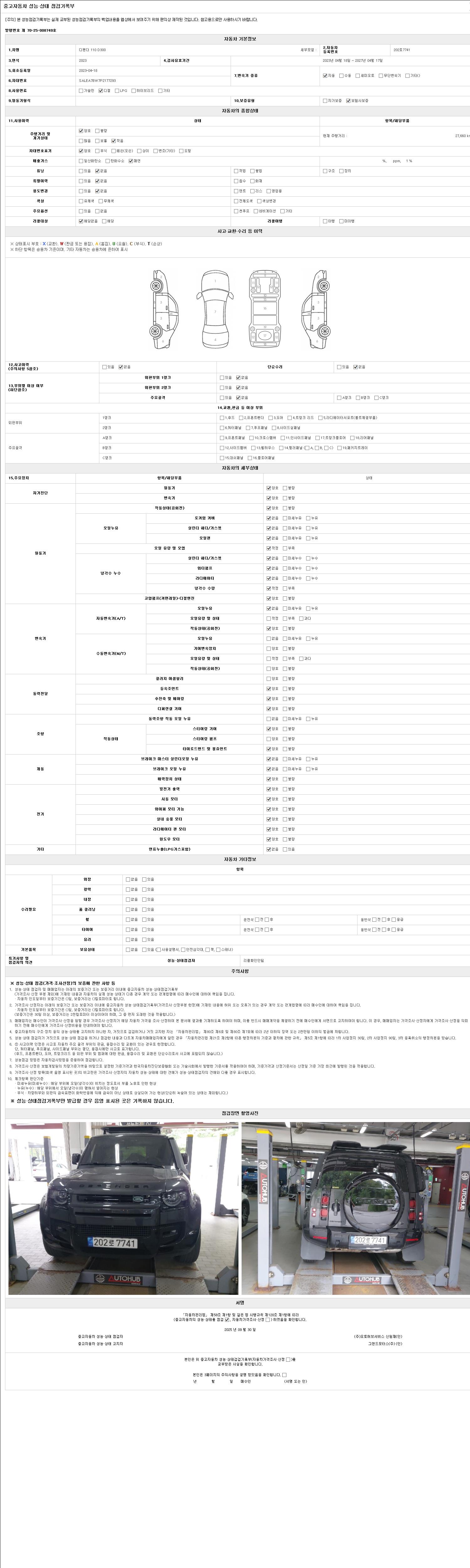 자동차관리법 시행규칙 제120조의 규정에 따라 별지 제 82호서식 《중고자동차 성능, 상태점검 기록부》를 발행한 성능, 상태점검자 및 매매자는 아래의 보증기간 또는 보증거리 이내의 중고자동차, 성능점검 기록부에 기재된 내용과 자동차의 실제 성능, 상태가 다른 경우 계약 또는 관계법령에 따라 매수인에 대하여 책임을 집니다.