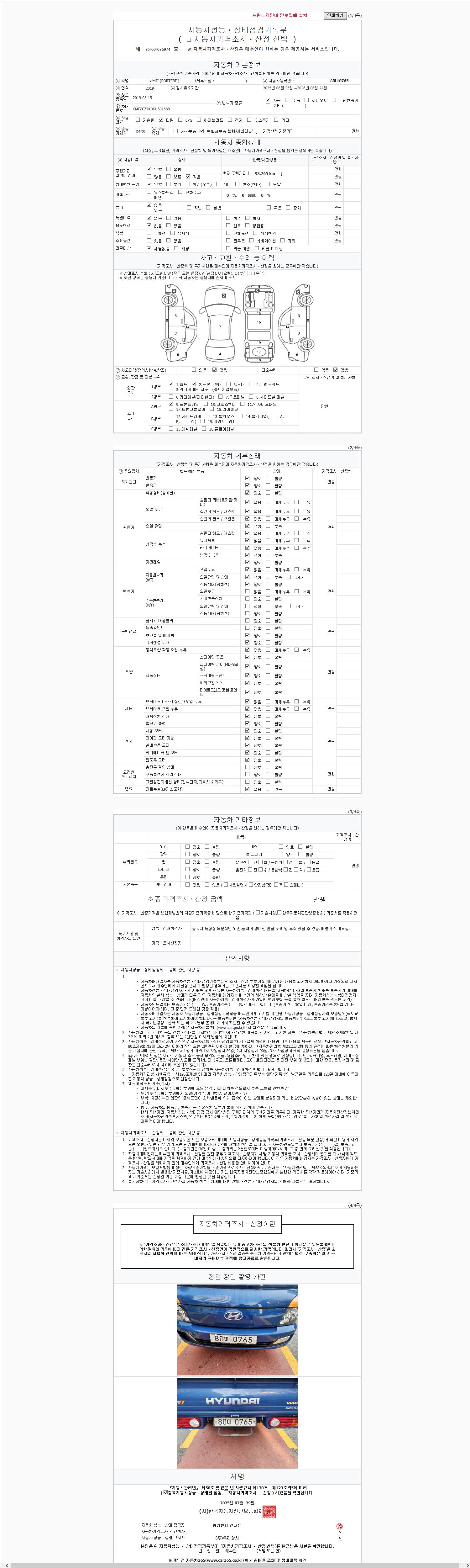 | 주행거리 | 93,765 km | 차량번호 | 80마0765 |