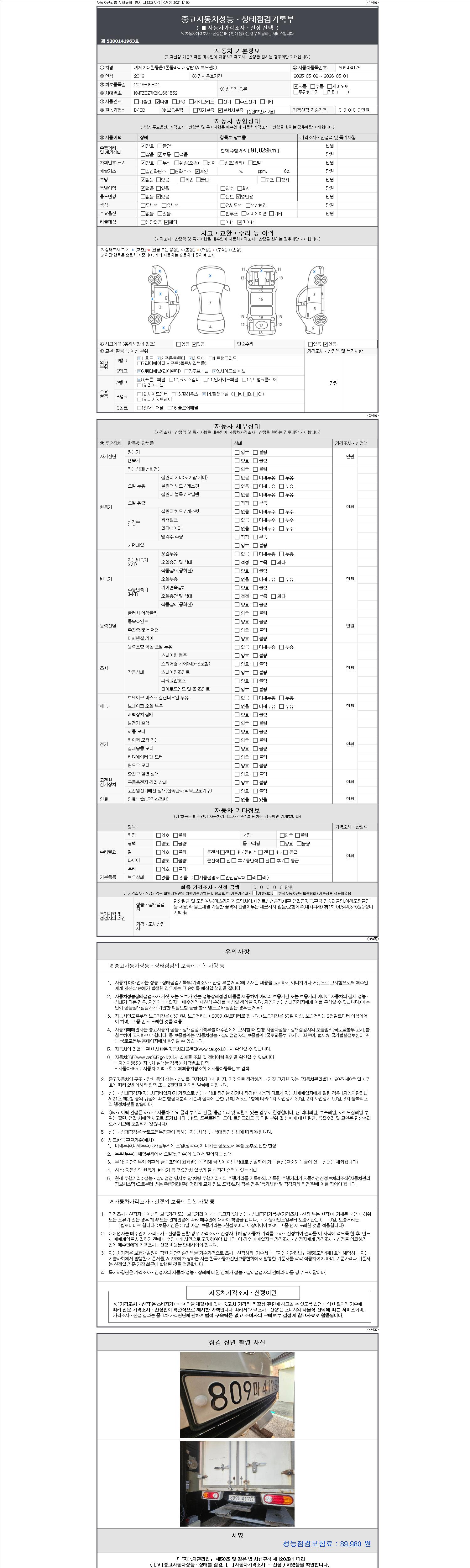 | 주행거리 | 91,029 km | 차량번호 | 809마4175 |