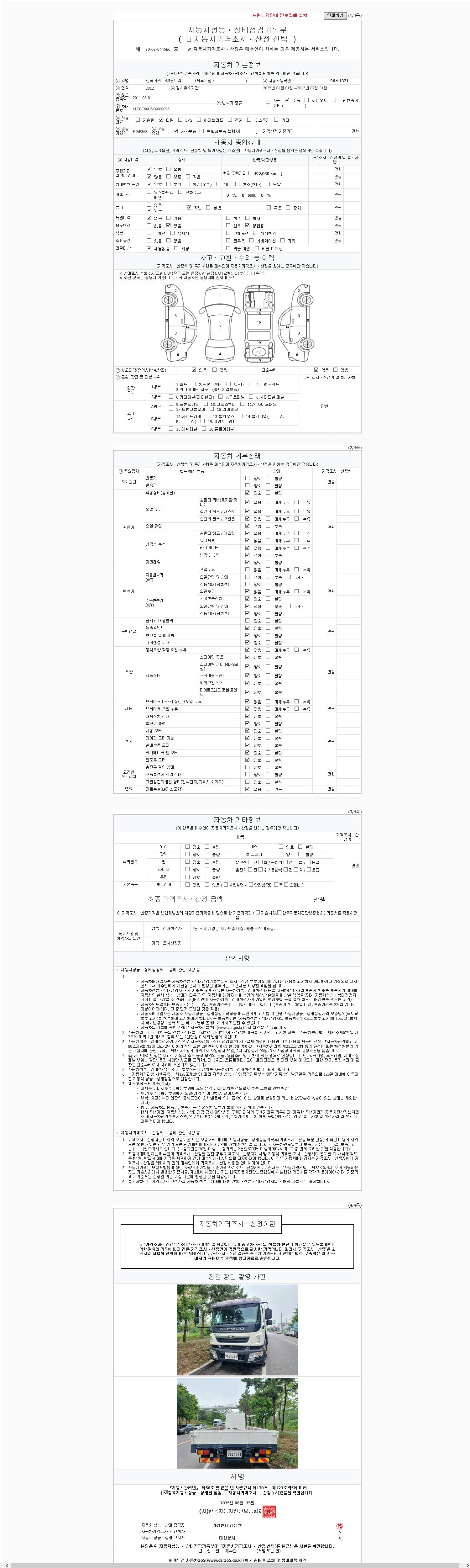 주행거리 492,000 km 차량번호 96소1371