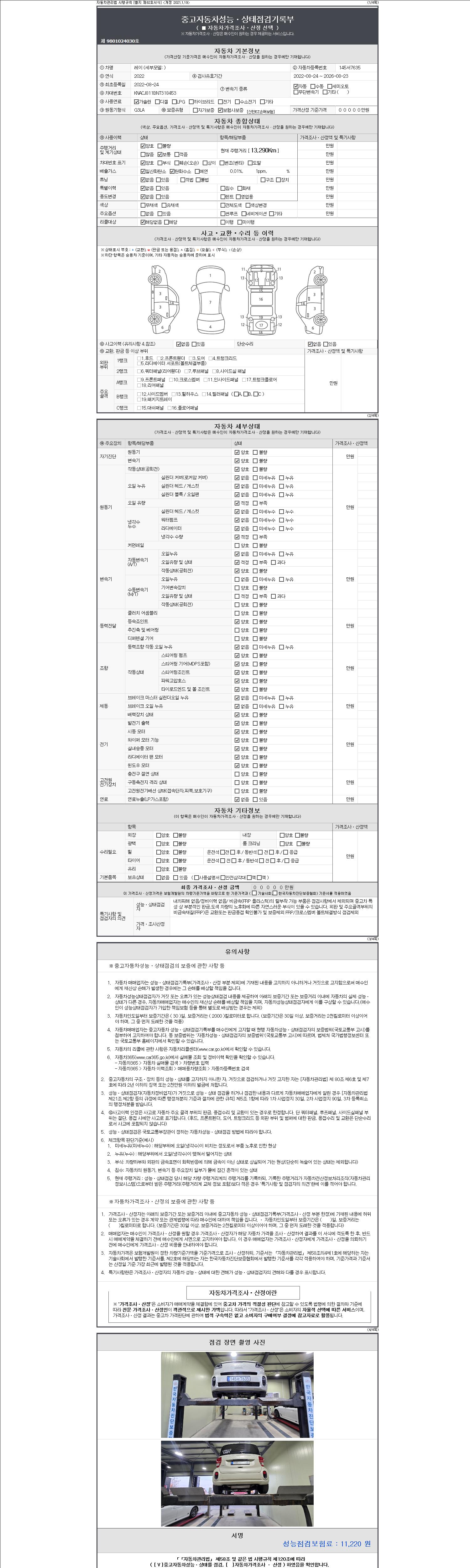 자동차관리법 시행규칙 제120조의 규정에 따라 별지 제 82호서식 《중고자동차 성능, 상태점검 기록부》를 발행한 성능, 상태점검자 및 매매자는 아래의 보증기간 또는 보증거리 이내의 중고자동차, 성능점검 기록부에 기재된 내용과 자동차의 실제 성능, 상태가 다른 경우 계약 또는 관계법령에 따라 매수인에 대하여 책임을 집니다.