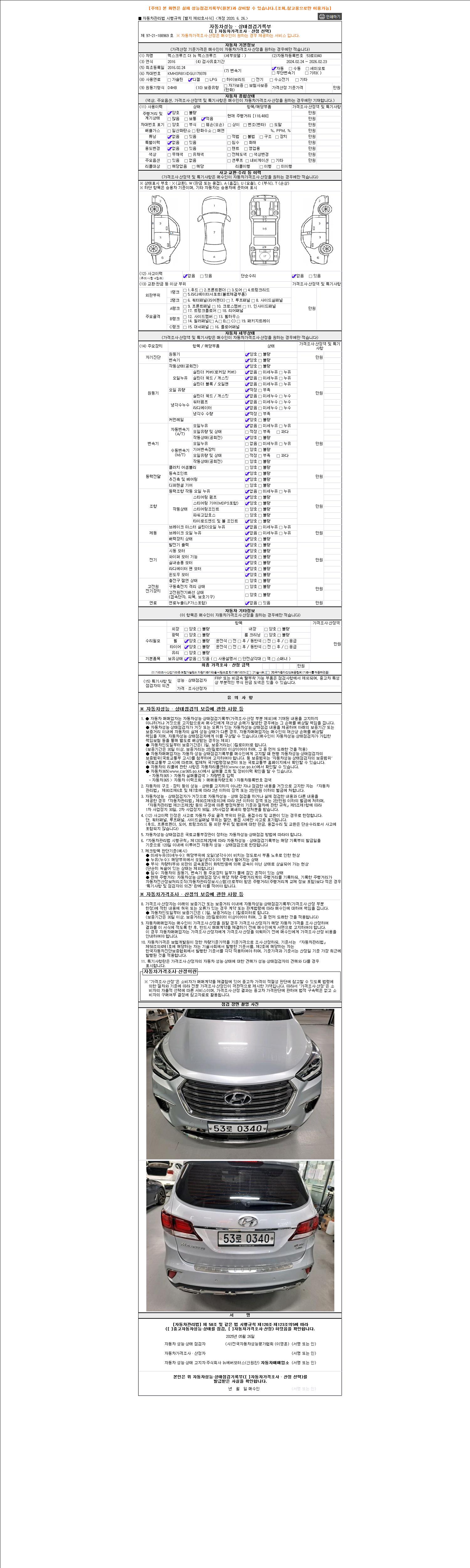 자동차관리법 시행규칙 제120조의 규정에 따라 별지 제 82호서식 《중고자동차 성능, 상태점검 기록부》를 발행한 성능, 상태점검자 및 매매자는 아래의 보증기간 또는 보증거리 이내의 중고자동차, 성능점검 기록부에 기재된 내용과 자동차의 실제 성능, 상태가 다른 경우 계약 또는 관계법령에 따라 매수인에 대하여 책임을 집니다.