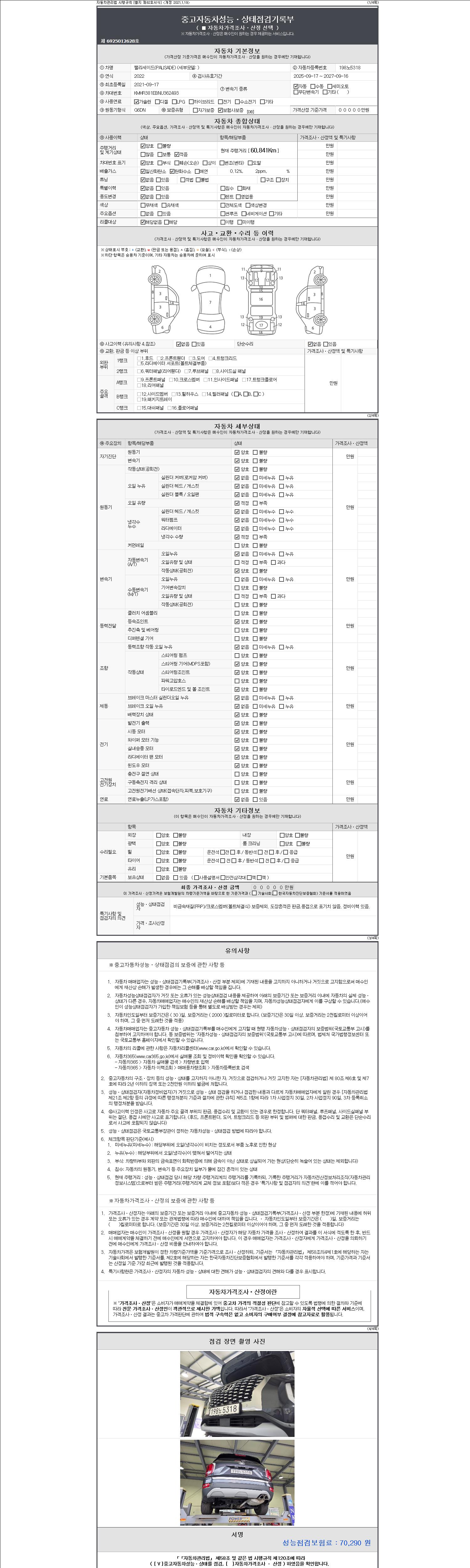 자동차관리법 시행규칙 제120조의 규정에 따라 별지 제 82호서식 《중고자동차 성능, 상태점검 기록부》를 발행한 성능, 상태점검자 및 매매자는 아래의 보증기간 또는 보증거리 이내의 중고자동차, 성능점검 기록부에 기재된 내용과 자동차의 실제 성능, 상태가 다른 경우 계약 또는 관계법령에 따라 매수인에 대하여 책임을 집니다.