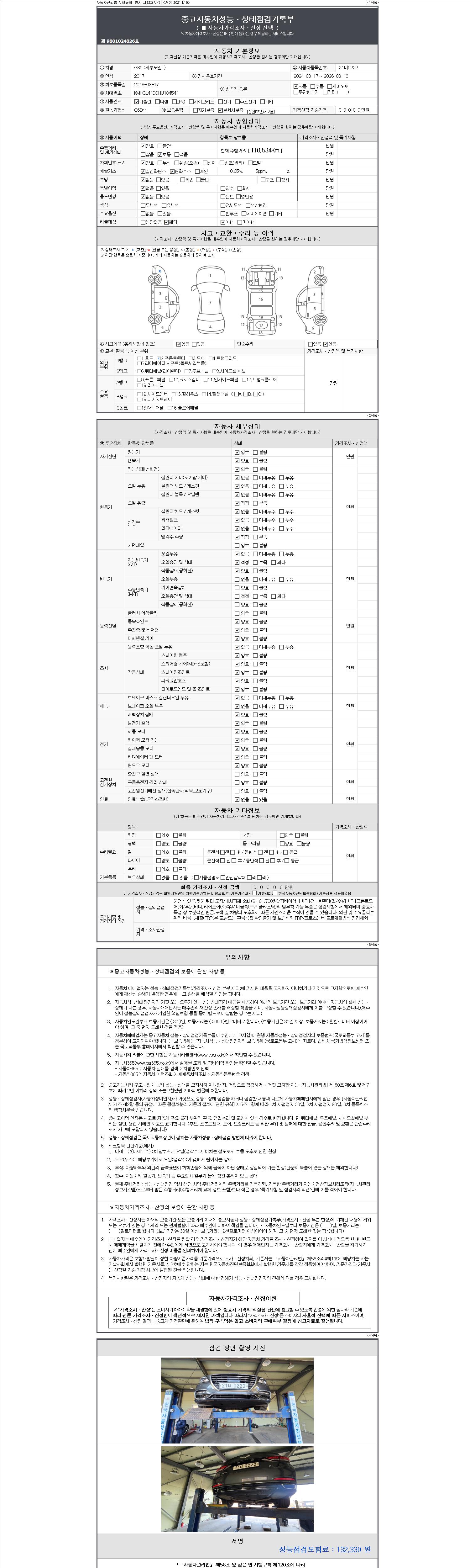 자동차관리법 시행규칙 제120조의 규정에 따라 별지 제 82호서식 《중고자동차 성능, 상태점검 기록부》를 발행한 성능, 상태점검자 및 매매자는 아래의 보증기간 또는 보증거리 이내의 중고자동차, 성능점검 기록부에 기재된 내용과 자동차의 실제 성능, 상태가 다른 경우 계약 또는 관계법령에 따라 매수인에 대하여 책임을 집니다.
