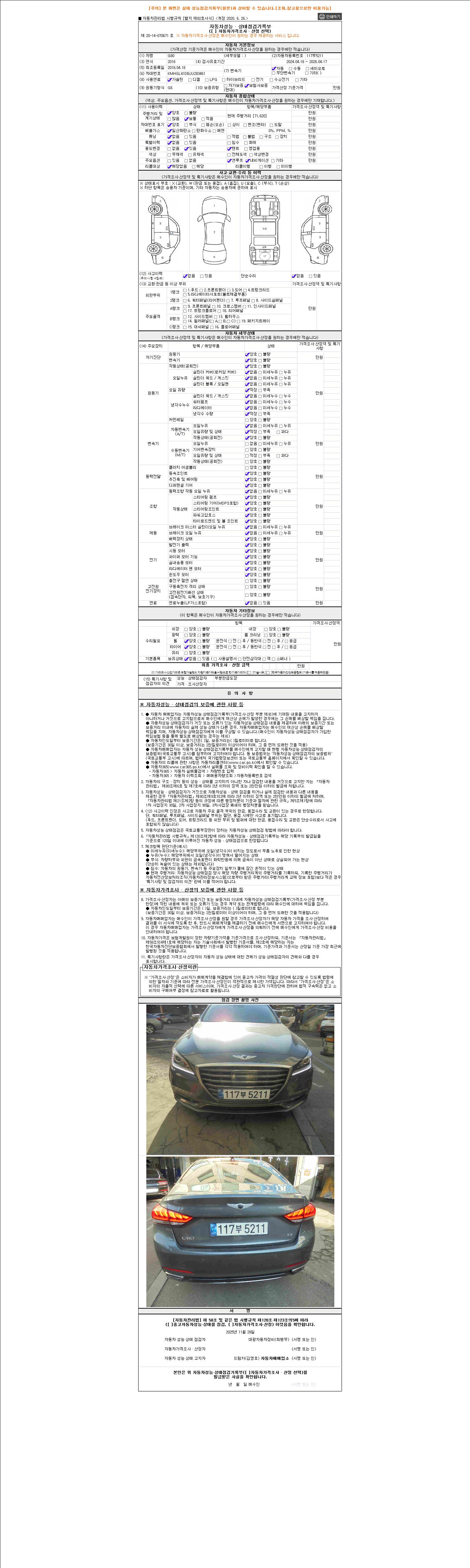 자동차관리법 시행규칙 제120조의 규정에 따라 별지 제 82호서식 《중고자동차 성능, 상태점검 기록부》를 발행한 성능, 상태점검자 및 매매자는 아래의 보증기간 또는 보증거리 이내의 중고자동차, 성능점검 기록부에 기재된 내용과 자동차의 실제 성능, 상태가 다른 경우 계약 또는 관계법령에 따라 매수인에 대하여 책임을 집니다.