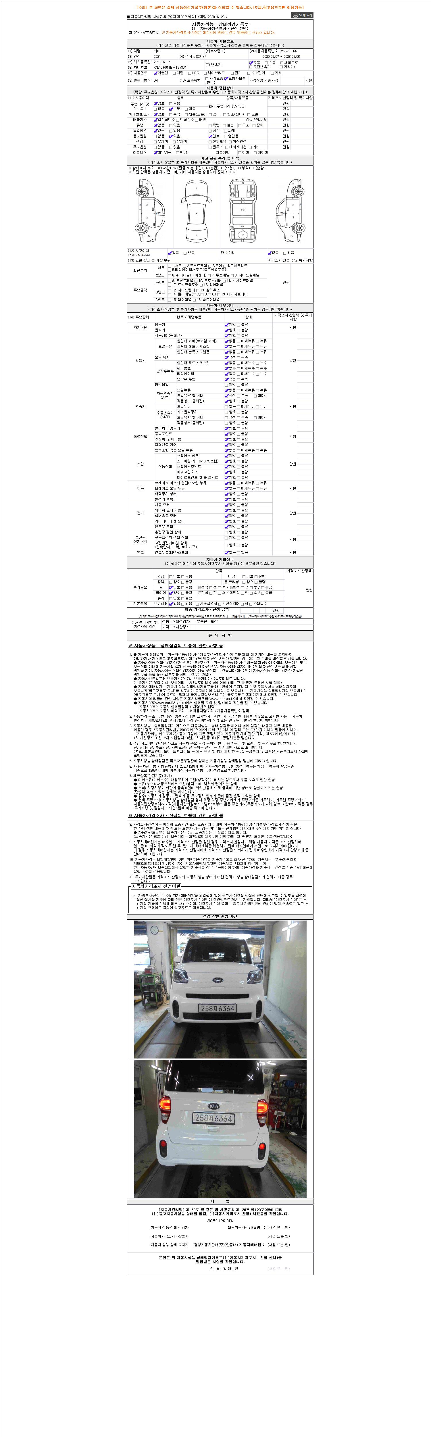 자동차관리법 시행규칙 제120조의 규정에 따라 별지 제 82호서식 《중고자동차 성능, 상태점검 기록부》를 발행한 성능, 상태점검자 및 매매자는 아래의 보증기간 또는 보증거리 이내의 중고자동차, 성능점검 기록부에 기재된 내용과 자동차의 실제 성능, 상태가 다른 경우 계약 또는 관계법령에 따라 매수인에 대하여 책임을 집니다.