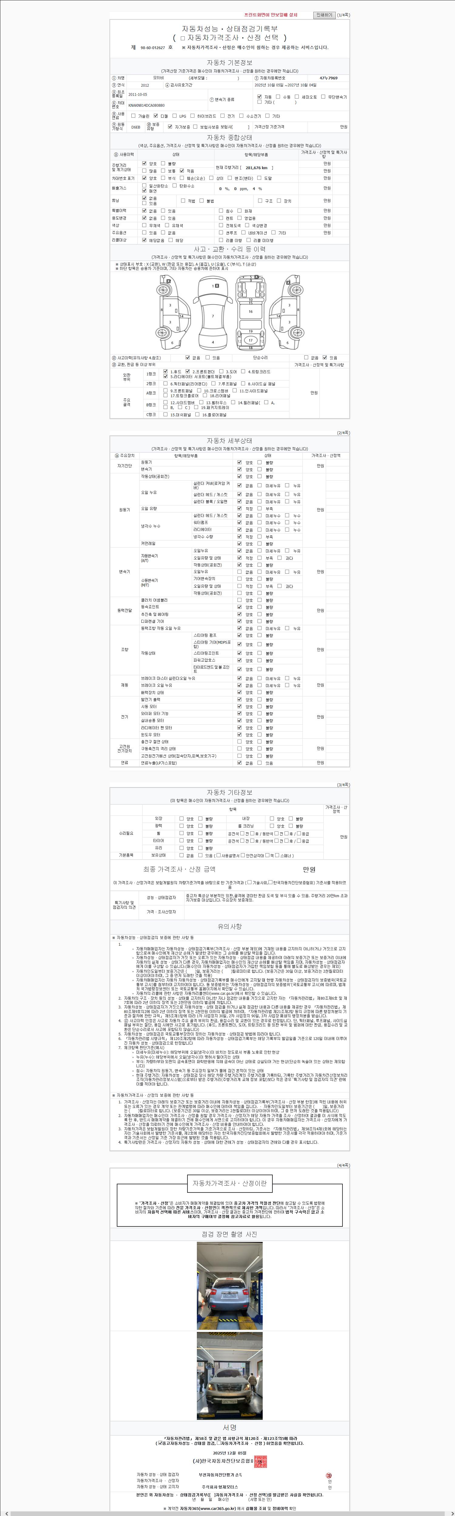 -중고자동차 매매업자를 통해 차량을 구입하실 경우 반드시 "중고자동차 성능, 상태점검 기록부"를 교뷰 받으셔야 하며, 매매업자는 반드시 의무 교부 하여야 압니다.