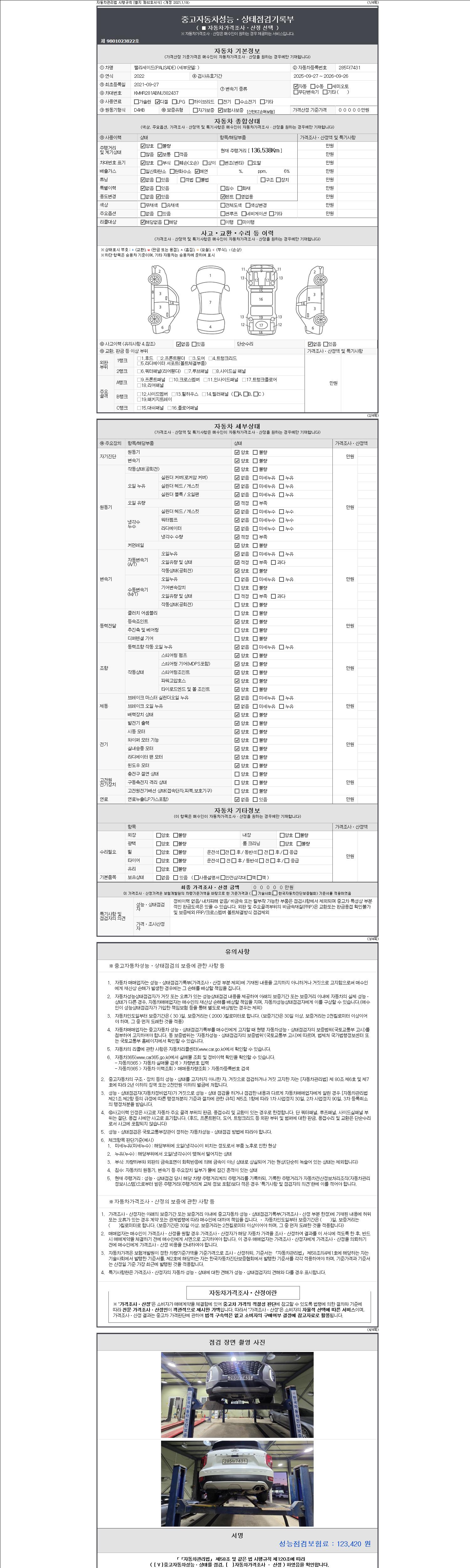 -중고자동차 매매업자를 통해 차량을 구입하실 경우 반드시 "중고자동차 성능, 상태점검 기록부"를 교뷰 받으셔야 하며, 매매업자는 반드시 의무 교부 하여야 압니다.