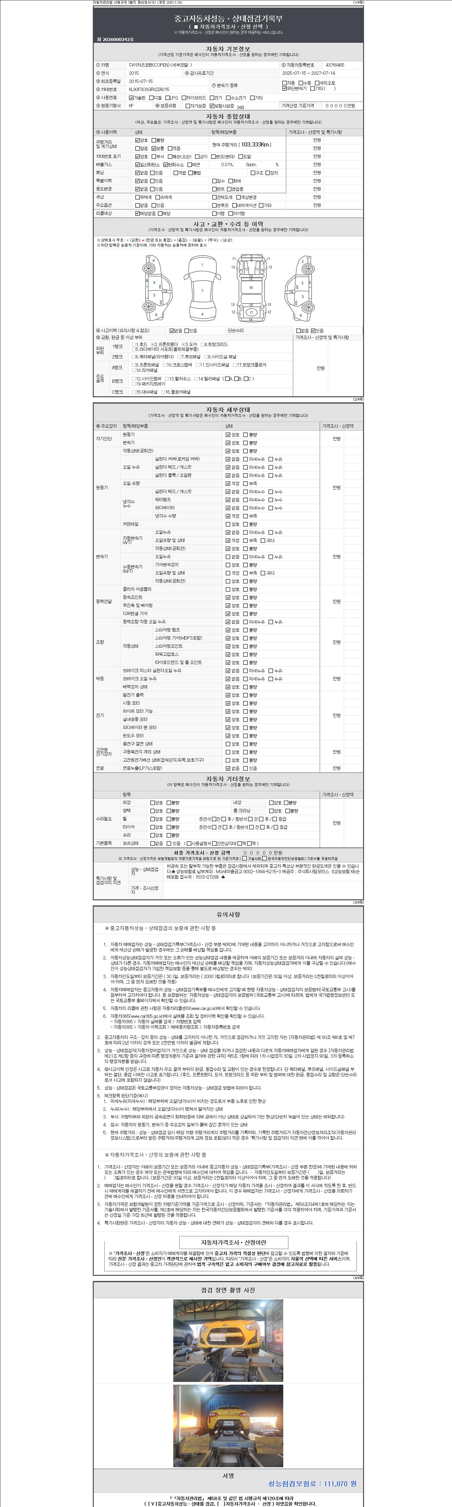 2. 차량 등록증이나 성능점검지 등을 상담자에게 요청및 확인하시고 사전에 미리 점검 하시기를 권유드립니다.