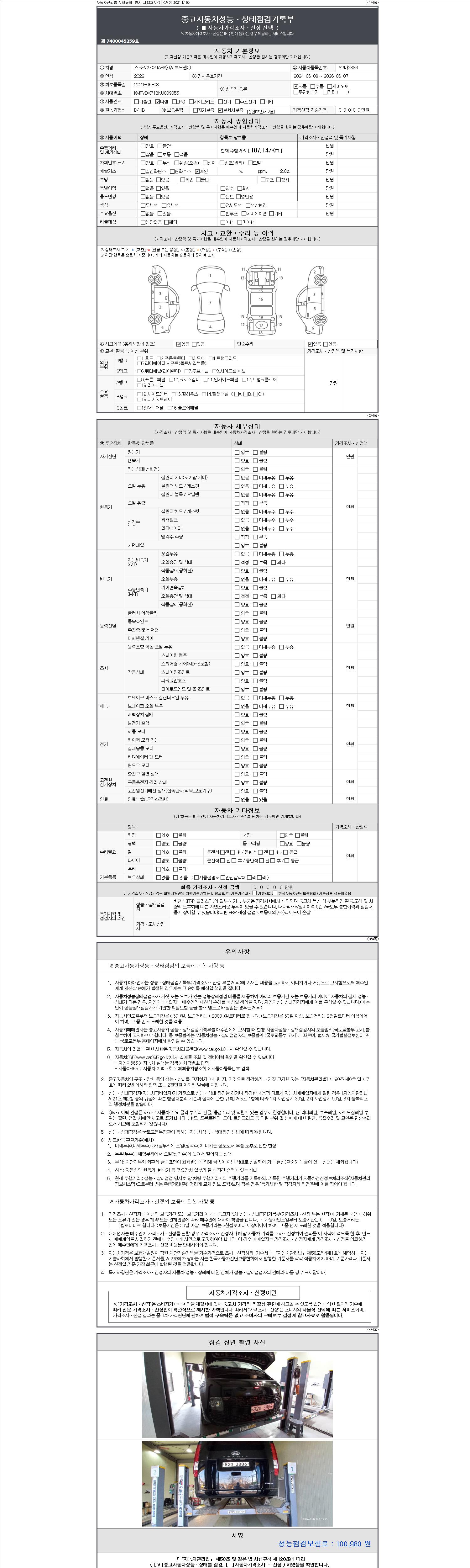 자동차관리법 시행규칙 제120조의 규정에 따라 별지 제 82호서식 《중고자동차 성능, 상태점검 기록부》를 발행한 성능, 상태점검자 및 매매자는 아래의 보증기간 또는 보증거리 이내의 중고자동차, 성능점검 기록부에 기재된 내용과 자동차의 실제 성능, 상태가 다른 경우 계약 또는 관계법령에 따라 매수인에 대하여 책임을 집니다.