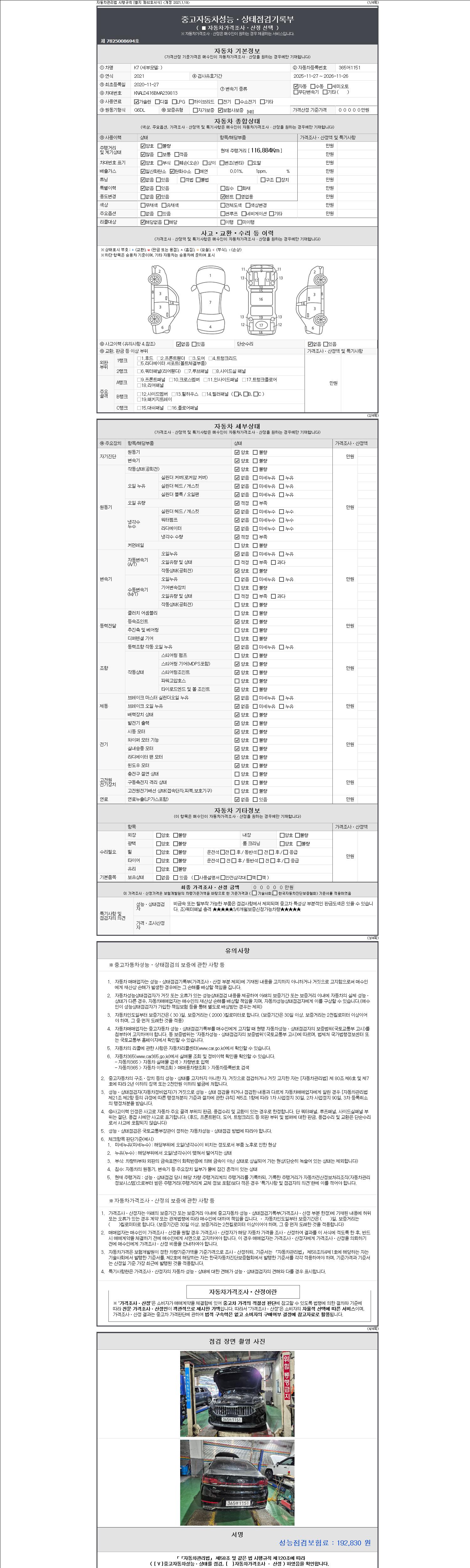 자동차관리법 시행규칙 제120조의 규정에 따라 별지 제 82호서식 《중고자동차 성능, 상태점검 기록부》를 발행한 성능, 상태점검자 및 매매자는 아래의 보증기간 또는 보증거리 이내의 중고자동차, 성능점검 기록부에 기재된 내용과 자동차의 실제 성능, 상태가 다른 경우 계약 또는 관계법령에 따라 매수인에 대하여 책임을 집니다.