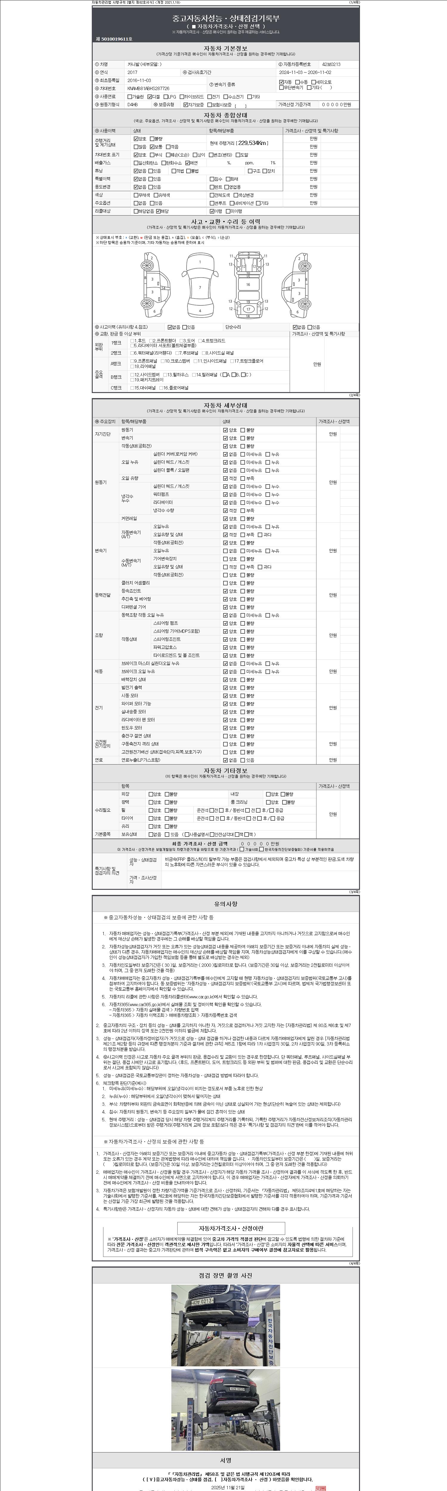 자동차관리법 시행규칙 제120조의 규정에 따라 별지 제 82호서식 《중고자동차 성능, 상태점검 기록부》를 발행한 성능, 상태점검자 및 매매자는 아래의 보증기간 또는 보증거리 이내의 중고자동차, 성능점검 기록부에 기재된 내용과 자동차의 실제 성능, 상태가 다른 경우 계약 또는 관계법령에 따라 매수인에 대하여 책임을 집니다.