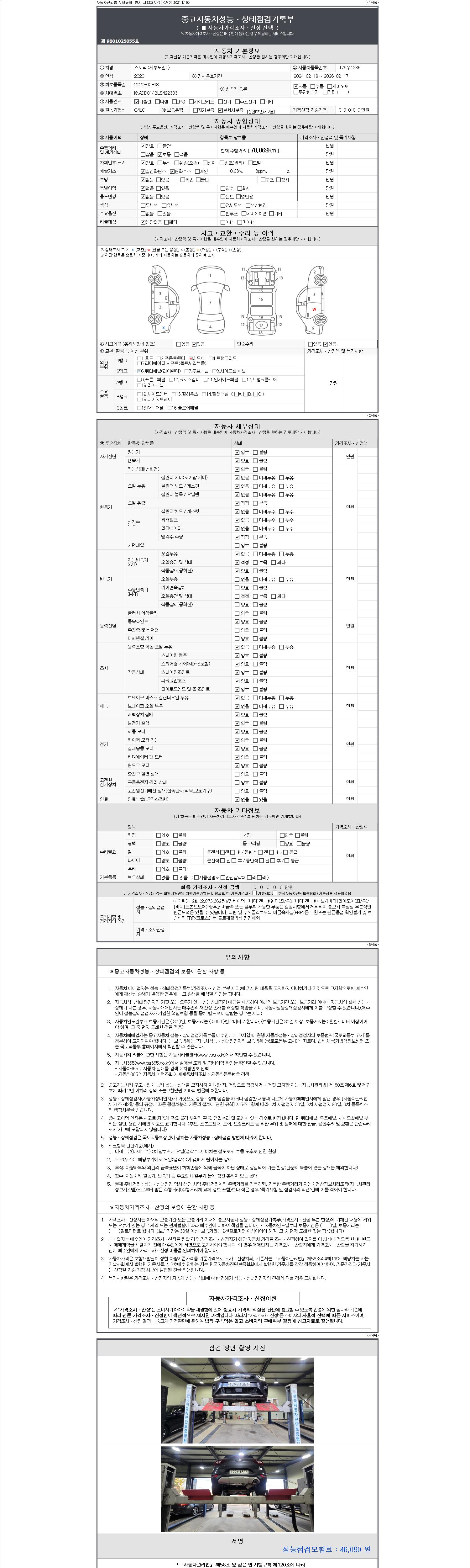 자동차관리법 시행규칙 제120조의 규정에 따라 별지 제 82호서식 《중고자동차 성능, 상태점검 기록부》를 발행한 성능, 상태점검자 및 매매자는 아래의 보증기간 또는 보증거리 이내의 중고자동차, 성능점검 기록부에 기재된 내용과 자동차의 실제 성능, 상태가 다른 경우 계약 또는 관계법령에 따라 매수인에 대하여 책임을 집니다.