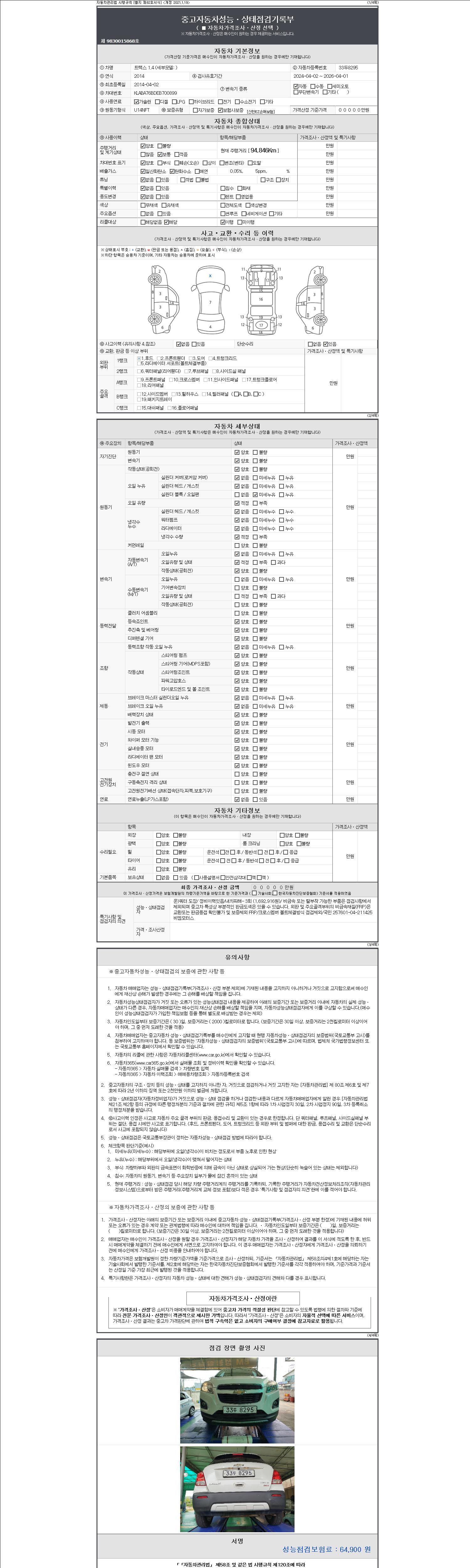 -중고자동차 매매업자를 통해 차량을 구입하실 경우 반드시 "중고자동차 성능, 상태점검 기록부"를 교뷰 받으셔야 하며, 매매업자는 반드시 의무 교부 하여야 압니다.