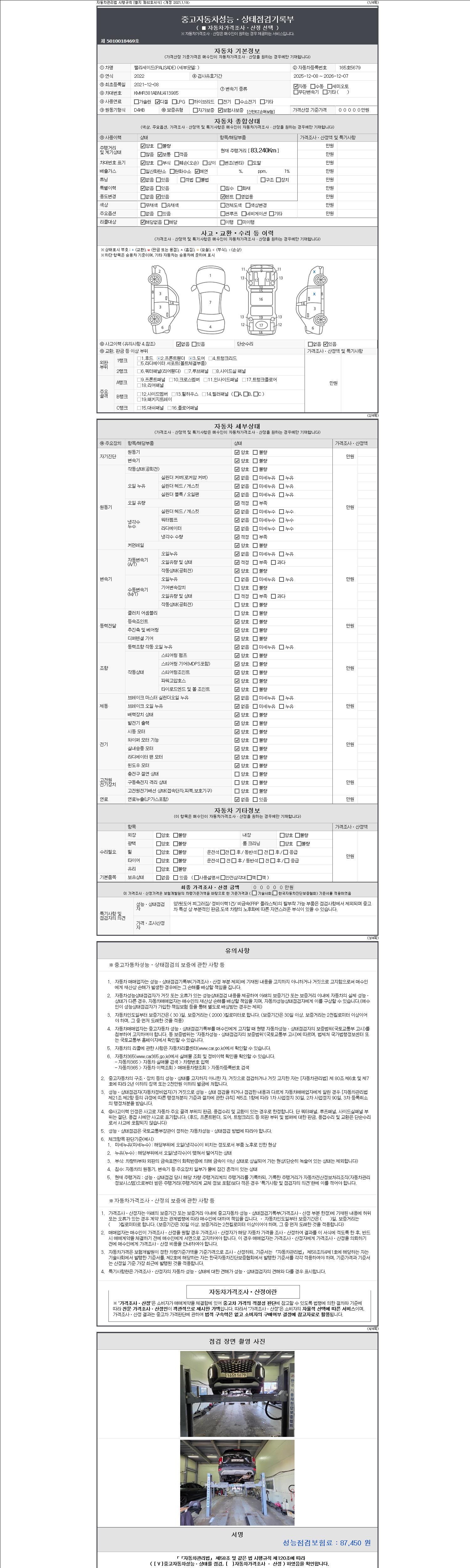 자동차관리법 시행규칙 제120조의 규정에 따라 별지 제 82호서식 《중고자동차 성능, 상태점검 기록부》를 발행한 성능, 상태점검자 및 매매자는 아래의 보증기간 또는 보증거리 이내의 중고자동차, 성능점검 기록부에 기재된 내용과 자동차의 실제 성능, 상태가 다른 경우 계약 또는 관계법령에 따라 매수인에 대하여 책임을 집니다.