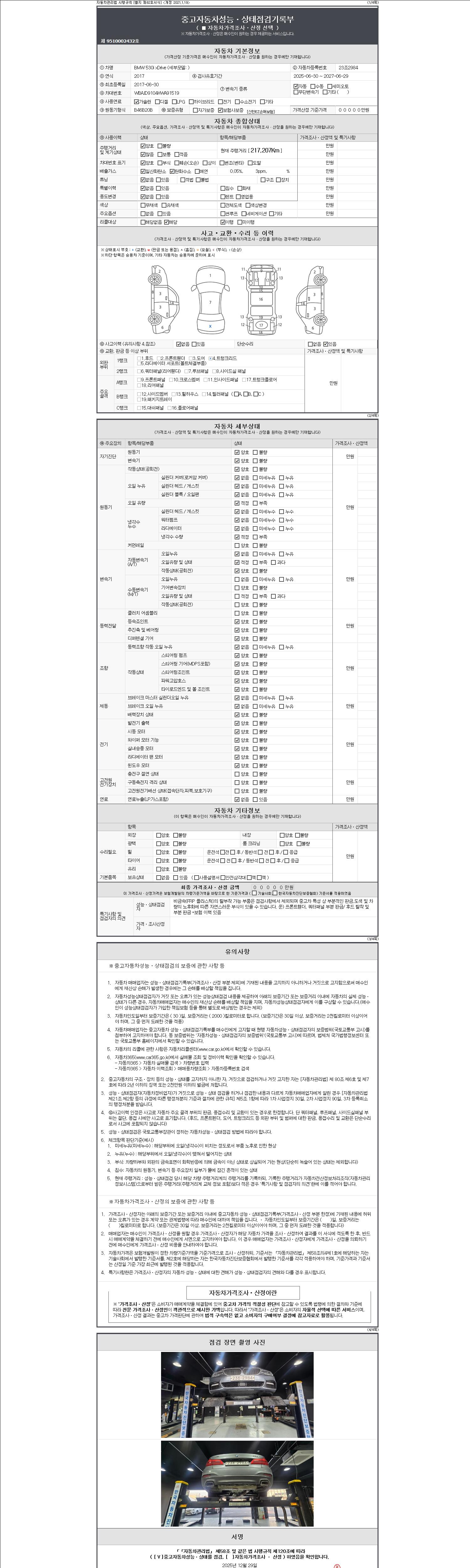 자동차관리법 시행규칙 제120조의 규정에 따라 별지 제 82호서식 《중고자동차 성능, 상태점검 기록부》를 발행한 성능, 상태점검자 및 매매자는 아래의 보증기간 또는 보증거리 이내의 중고자동차, 성능점검 기록부에 기재된 내용과 자동차의 실제 성능, 상태가 다른 경우 계약 또는 관계법령에 따라 매수인에 대하여 책임을 집니다.