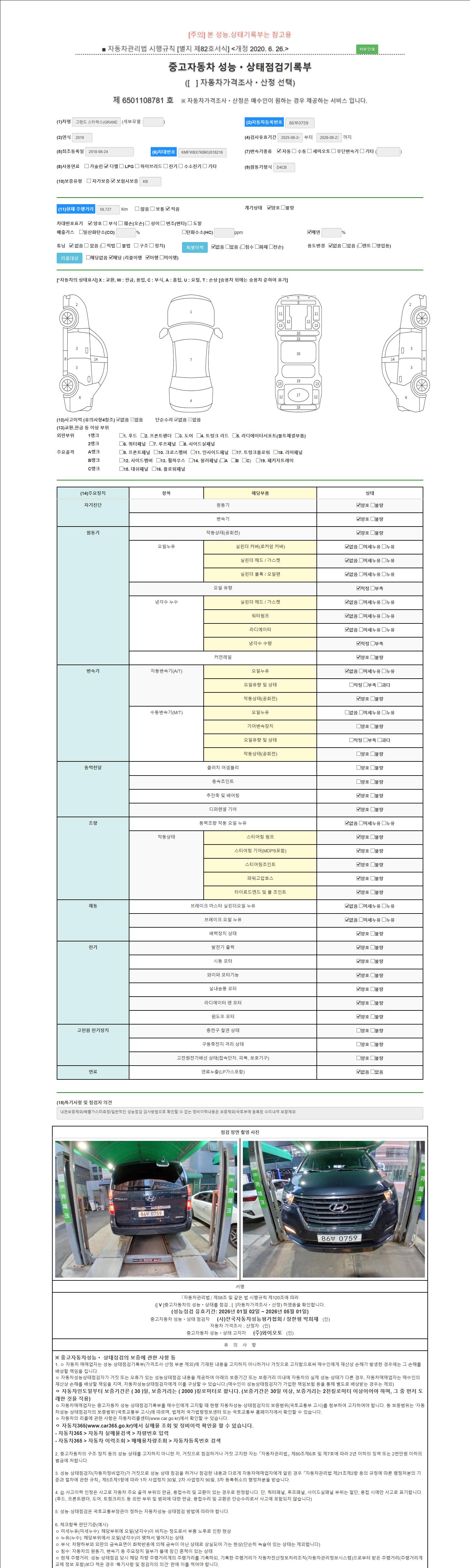 자동차관리법 시행규칙 제120조의 규정에 따라 별지 제 82호서식 《중고자동차 성능, 상태점검 기록부》를 발행한 성능, 상태점검자 및 매매자는 아래의 보증기간 또는 보증거리 이내의 중고자동차, 성능점검 기록부에 기재된 내용과 자동차의 실제 성능, 상태가 다른 경우 계약 또는 관계법령에 따라 매수인에 대하여 책임을 집니다.