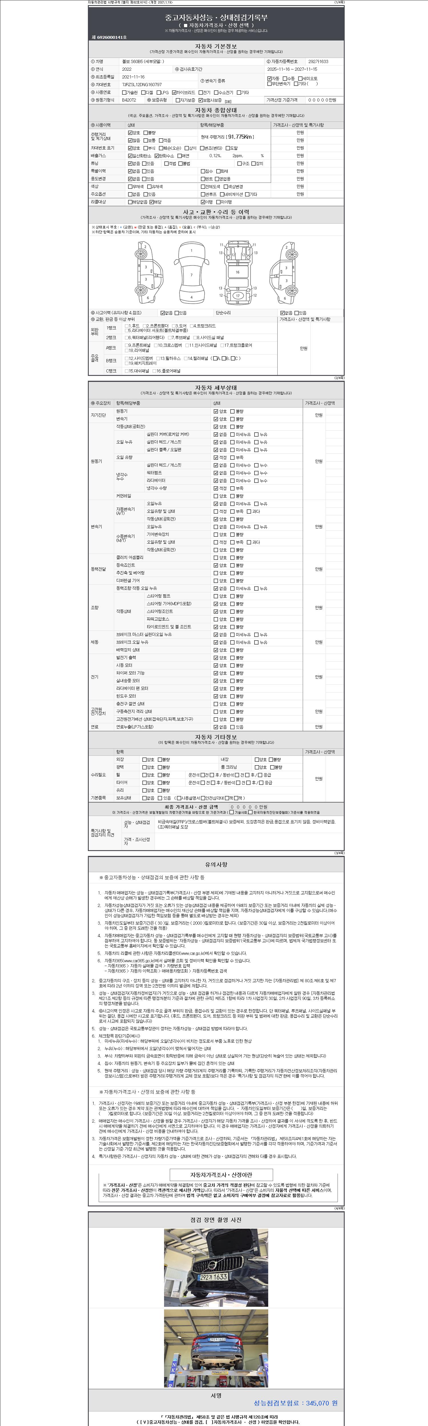 자동차관리법 시행규칙 제120조의 규정에 따라 별지 제 82호서식 《중고자동차 성능, 상태점검 기록부》를 발행한 성능, 상태점검자 및 매매자는 아래의 보증기간 또는 보증거리 이내의 중고자동차, 성능점검 기록부에 기재된 내용과 자동차의 실제 성능, 상태가 다른 경우 계약 또는 관계법령에 따라 매수인에 대하여 책임을 집니다.