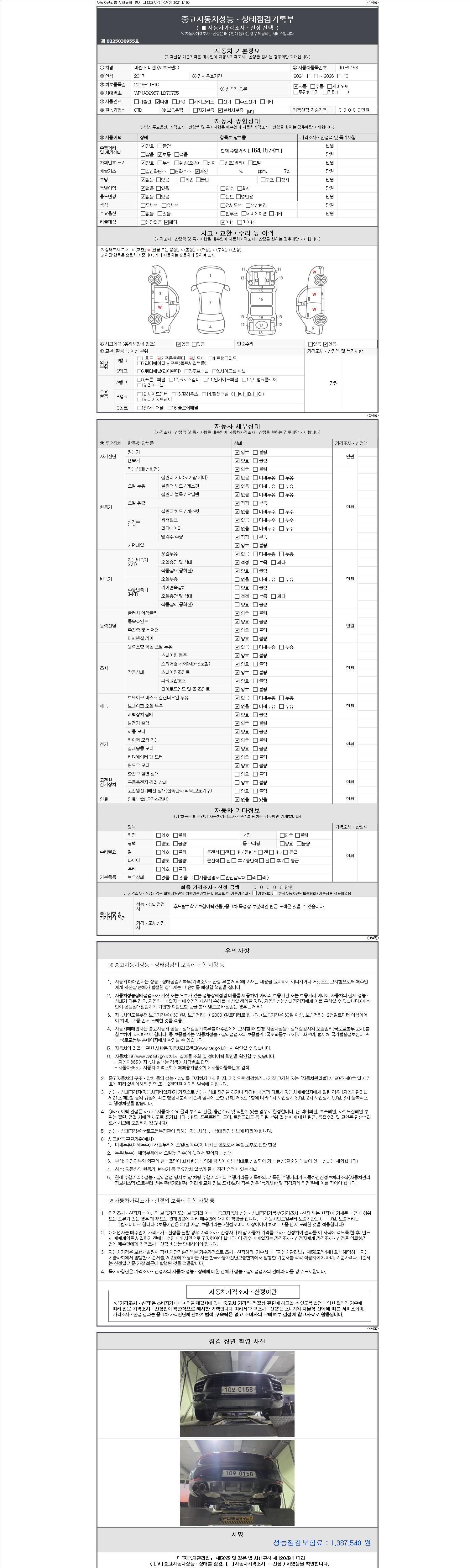 자동차관리법 시행규칙 제120조의 규정에 따라 별지 제 82호서식 《중고자동차 성능, 상태점검 기록부》를 발행한 성능, 상태점검자 및 매매자는 아래의 보증기간 또는 보증거리 이내의 중고자동차, 성능점검 기록부에 기재된 내용과 자동차의 실제 성능, 상태가 다른 경우 계약 또는 관계법령에 따라 매수인에 대하여 책임을 집니다.