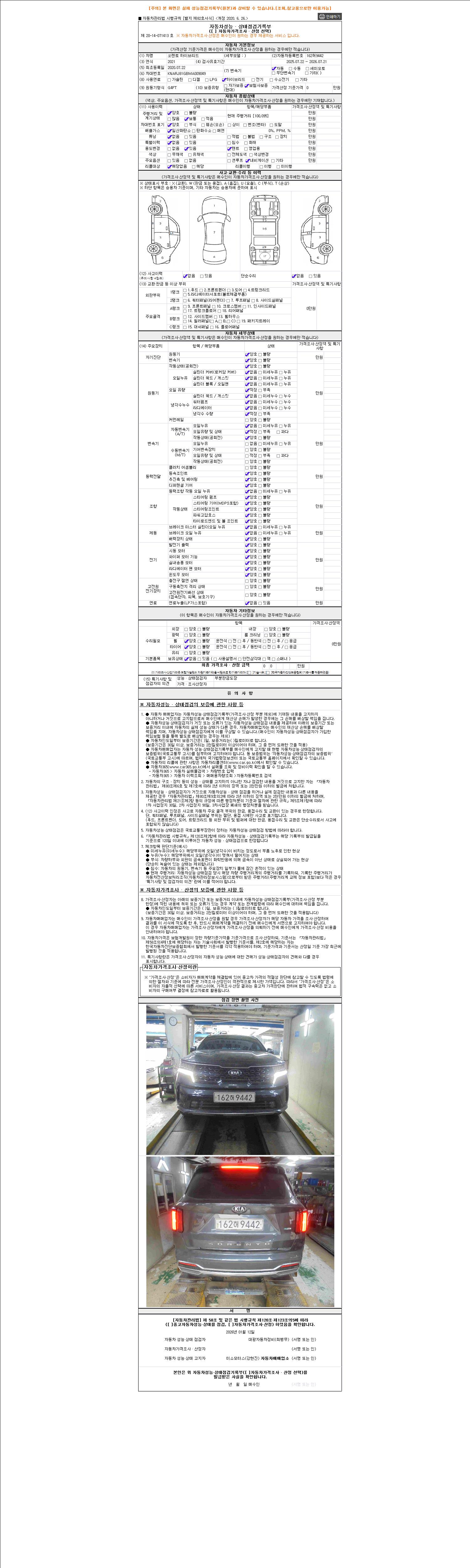 자동차관리법 시행규칙 제120조의 규정에 따라 별지 제 82호서식 《중고자동차 성능, 상태점검 기록부》를 발행한 성능, 상태점검자 및 매매자는 아래의 보증기간 또는 보증거리 이내의 중고자동차, 성능점검 기록부에 기재된 내용과 자동차의 실제 성능, 상태가 다른 경우 계약 또는 관계법령에 따라 매수인에 대하여 책임을 집니다.