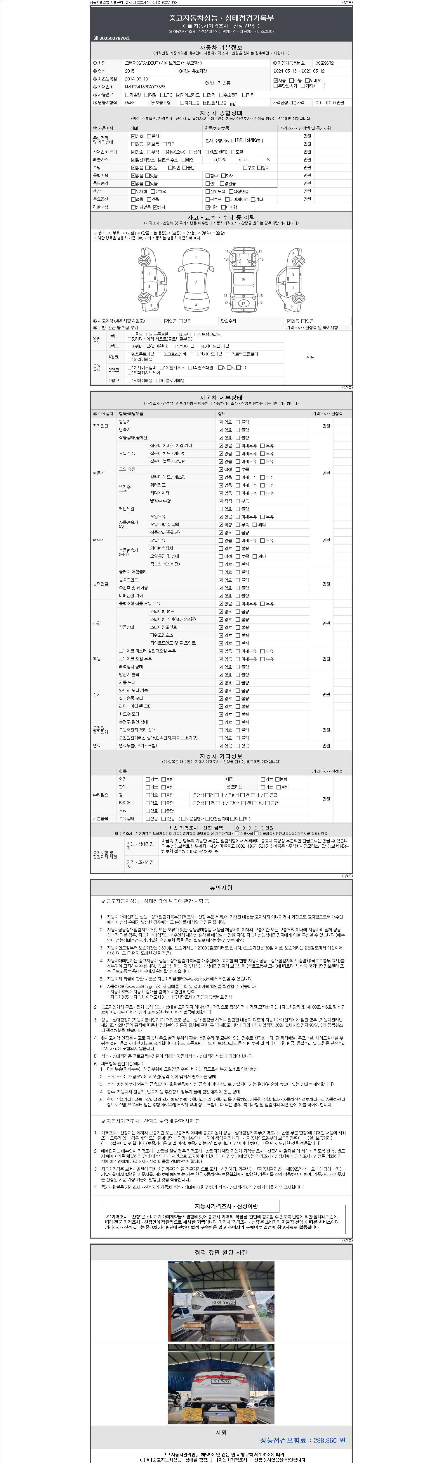 -중고자동차 매매업자를 통해 차량을 구입하실 경우 반드시 "중고자동차 성능, 상태점검 기록부"를 교뷰 받으셔야 하며, 매매업자는 반드시 의무 교부 하여야 압니다.
