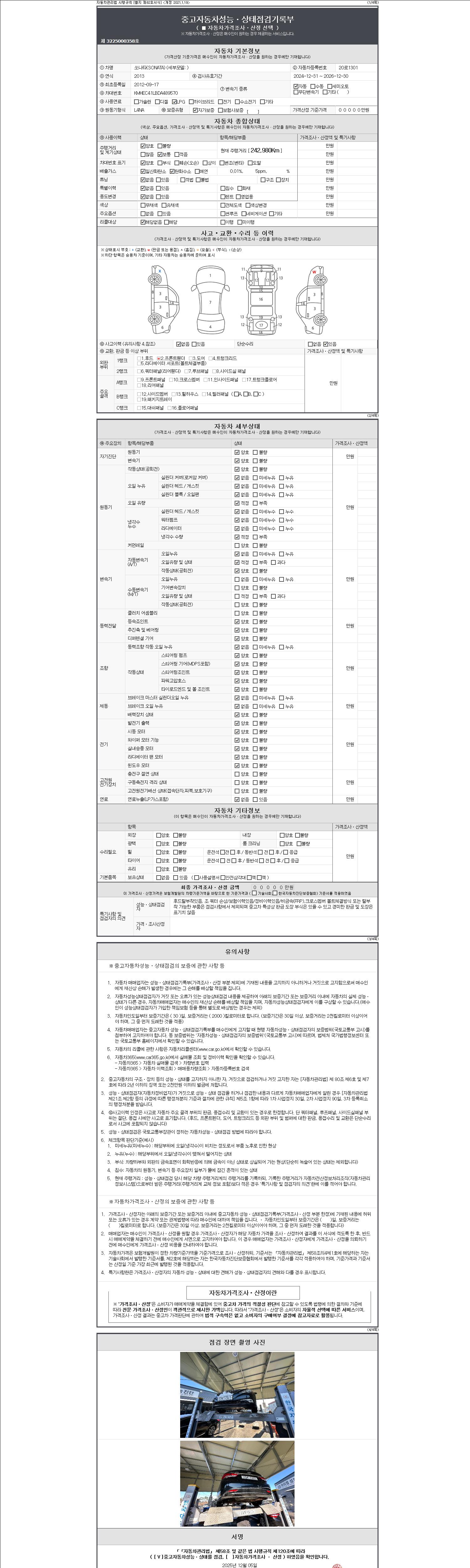 -중고자동차 매매업자를 통해 차량을 구입하실 경우 반드시 "중고자동차 성능, 상태점검 기록부"를 교뷰 받으셔야 하며, 매매업자는 반드시 의무 교부 하여야 압니다.